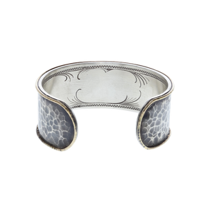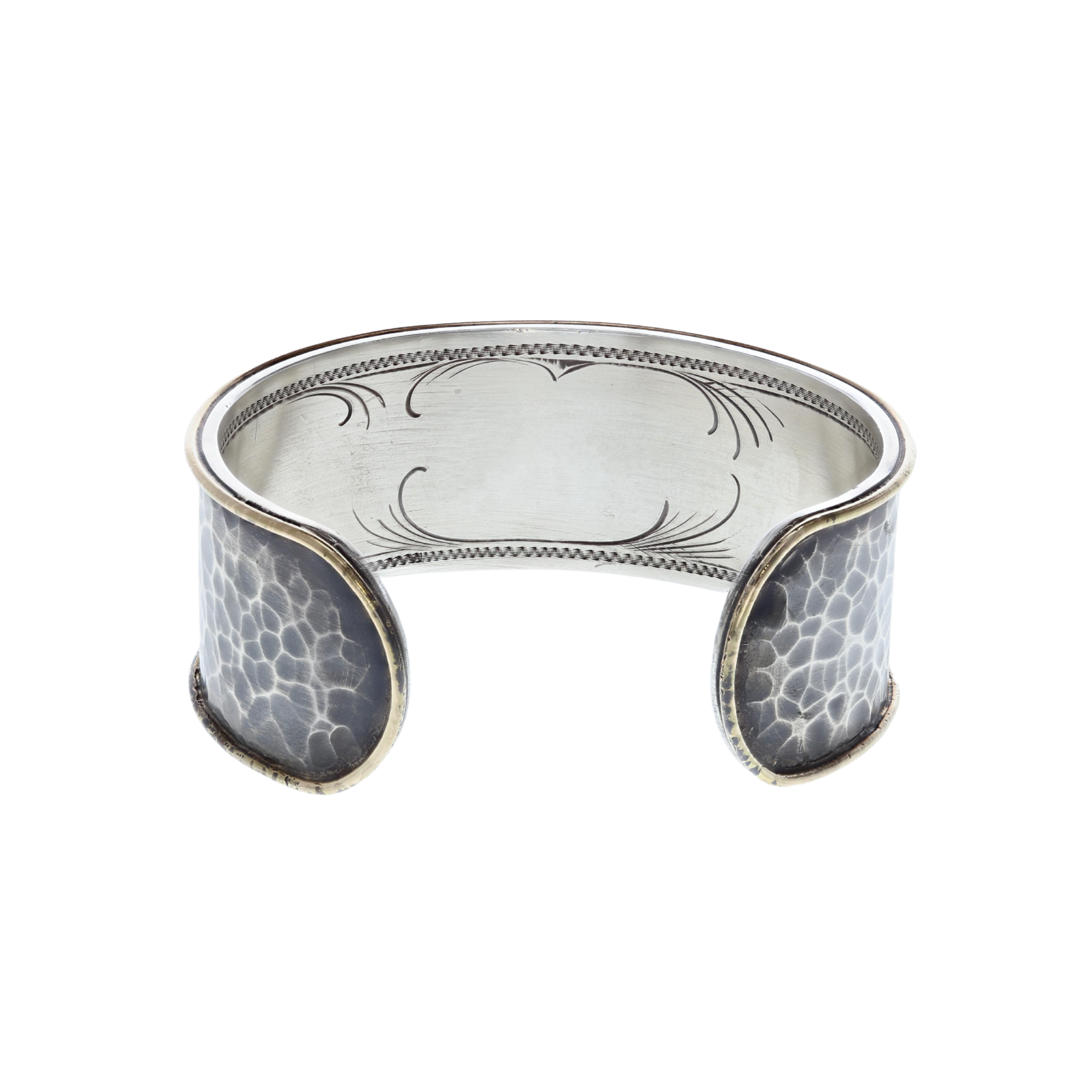 This 1-inch wide sterling silver cuff bracelet features a hammered finish and is accented by a 20-gauge 14k yellow gold round wire border for a refined, expert-crafted appearance. Made and engraved by hand in Texas by Clint Orms Engravers & Silversmiths.