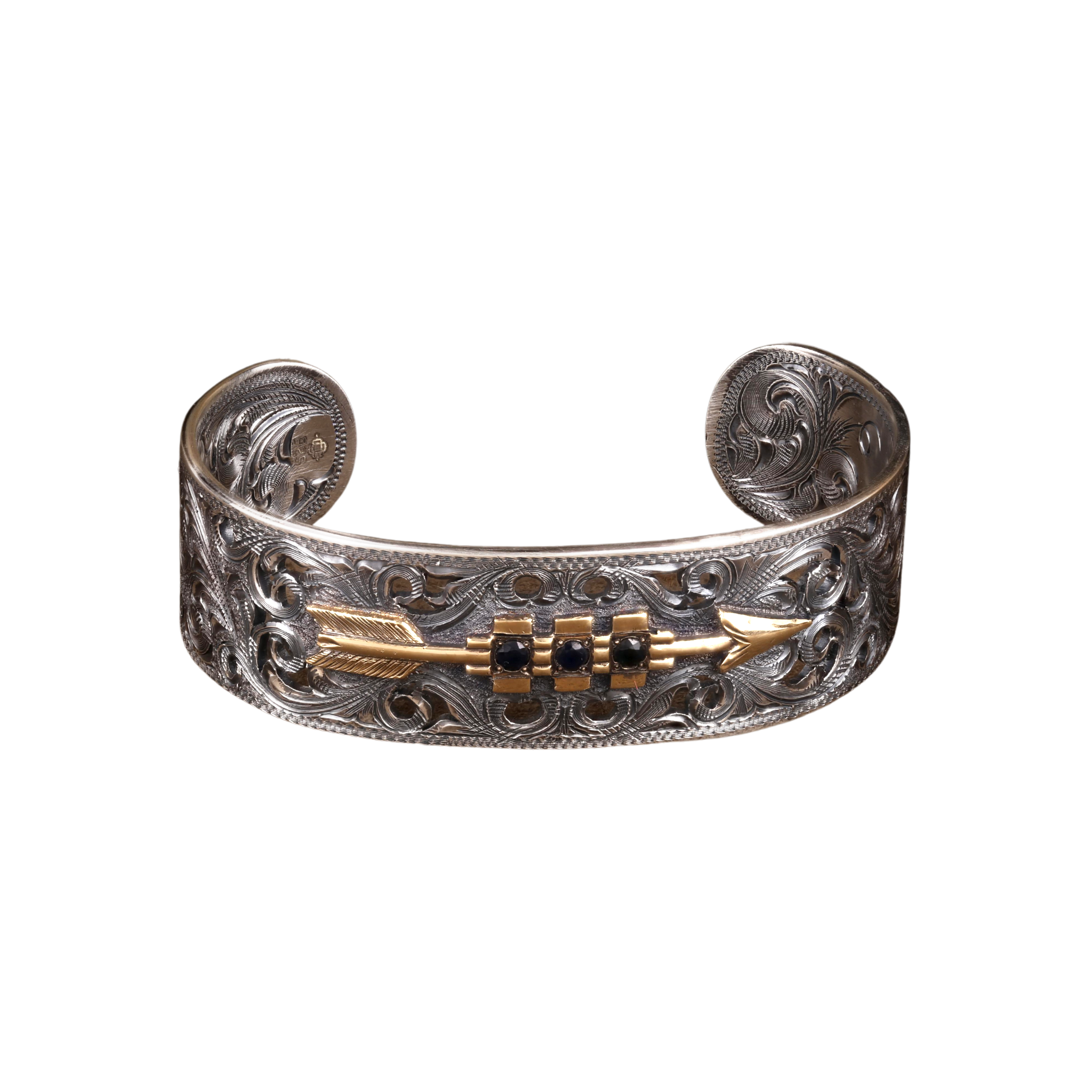 0.8" Wide Sterling Silver Bracelet with 14k yellow gold arrow in center set with 3 - 3mm sapphires. Made and engraved by hand in Texas by Clint Orms Engravers & Silversmiths.