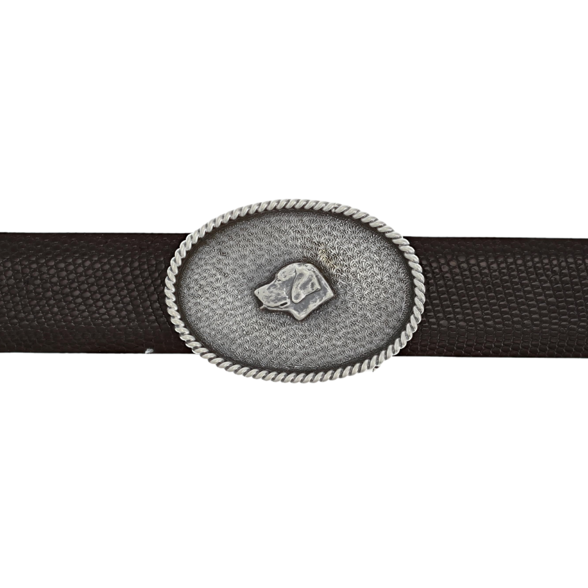 2.5” x 1.7” oval trophy buckle. Sterling buckle with sterling lab in center.  14 gauge sterling silver rope, wheatgrass. Fits belts up to 1.25" wide. Made and engraved by hand in Texas by Clint Orms Engravers & Silversmiths.