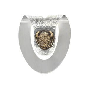 Our handmade San Saba 1403 Gold Buffalo Money Clip showcases a 14-karat gold buffalo over a hammered sterling silver background. Made and engraved by hand in Texas by Clint Orms Engravers & Silversmiths.