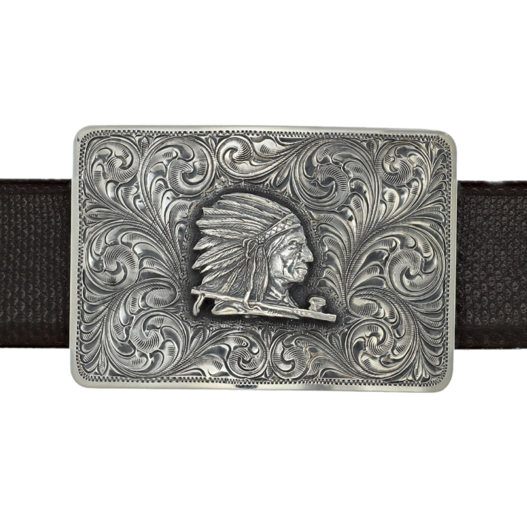 3.2" x 2.2" sterling silver rectangular trophy buckle, sterling silver Indian Chief centered by scroll engraving. Made and engraved by hand in Texas by Clint Orms Engravers & Silversmiths.