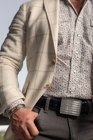 The Brandes 1806 from Clint Oms offers an artisan take on an American flag buckle with accurate design and intricate detailing. This sterling silver trophy buckle features a classic rectangular shape with hand-engraved stars and stripes. A detailed 20-gauge rope border frames the flag design.