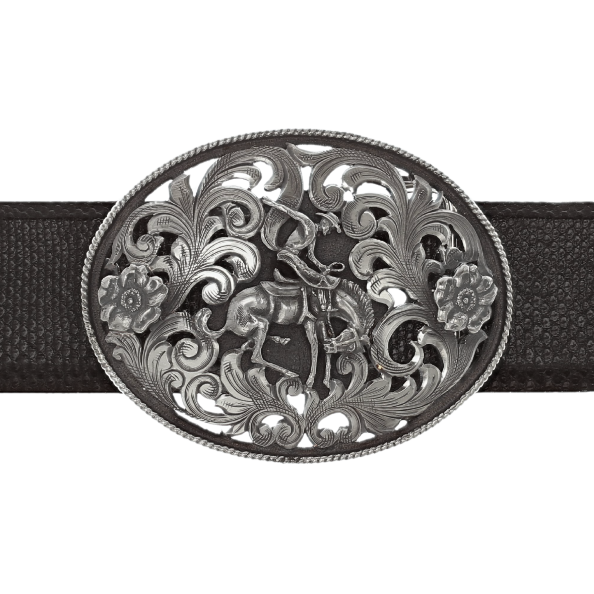 3.4" x 2.6" Sterling Silver Oval Trophy Buckle with sterling silver bronc rider in center, two sterling silver flowers and 18ga sterling silver rope edge. Filigreed and Engraved. Made and engraved by hand in Texas by Clint Orms Engravers & Silversmiths.