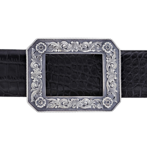 Measuring 2.88" by 2.16", the Garrison 1801 is a sterling silver rectangular trophy buckle featuring gently cropped corners and a 1.75" by 1.5" rectangular cutout at its center. Each corner is adorned with a flower motif, complemented by intricate sterling silver scroll overlays and a 20-gauge sterling silver rope border. The buckle is engraved and equipped with a 1.5" swinger back for secure fastening. Made and engraved by hand in Texas by Clint Orms Engravers & Silversmiths.