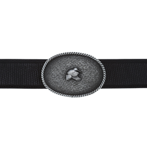2.5" x 1.7" sterling silver oval trophy buckle with a flying woodcock on a wheatgrass finish and 16 gauge rope edge. Fits belts up to 1.25" wide. Made and engraved by hand in Texas by Clint Orms Engravers & Silversmiths.