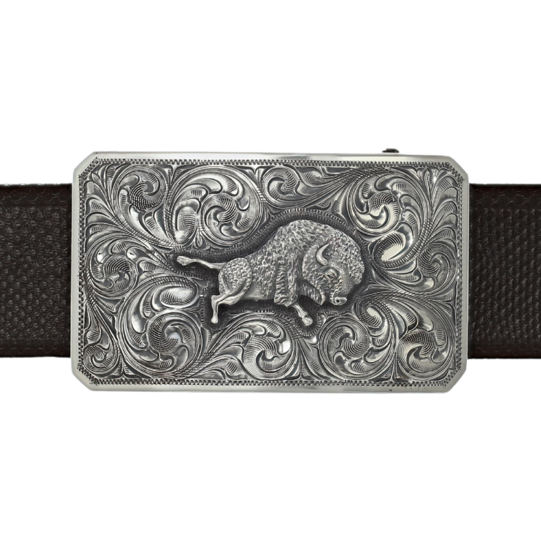 This trophy-style buckle measures 3.25" by 1.97" and features a sterling silver buffalo centerpiece with detailed engraving. Fits belts up to 1.5" wide. Made and engraved by hand in Texas by Clint Orms Engravers & Silversmiths.