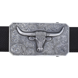 The handmade Kenedy 1819 Sterling Silver Trophy Buckle pays tribute to the longhorn, a beloved creature and symbol for Texans. This 3.5” x 1.9" rectangular trophy buckle features a large longhorn head atop sterling silver scroll engravings. Top and bottom shelves add interest to this intricate piece. The back comes in a standard 1.5” size. Made and engraved by hand in Texas by Clint Orms Engravers & Silversmiths.