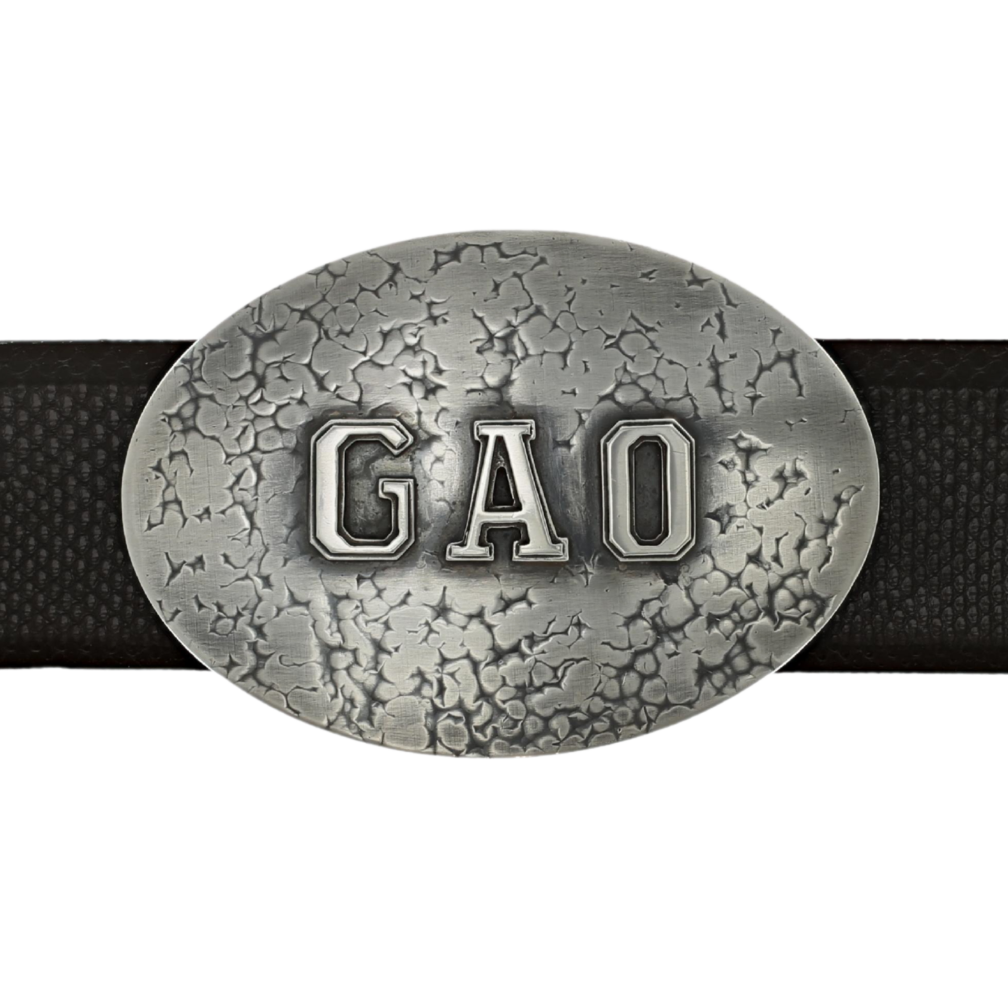 This 3.25" x 2.30" oval sterling trophy buckle features three sterling-stamped initials centered against a reverse hammered background. Made and engraved by hand in Texas by Clint Orms Engravers & Silversmiths.