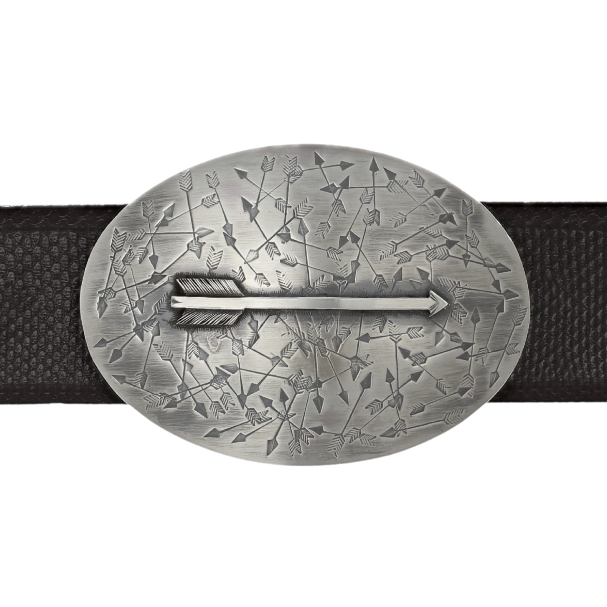 This sterling silver oval trophy buckle measures 3.25" by 2.30" and features a central sterling arrow set against a textured arrow-stamp background. It has a matte finish and includes a 1-1/2" swivel back for secure attachment.