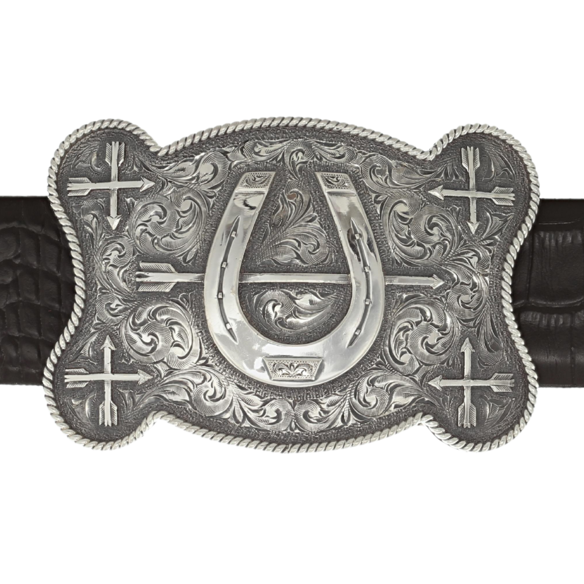 3.85 x 2.55" scalloped trophy buckle, trophy style buckle, scalloped, sterling rope edge around the exterior of the buckle, sterling horseshoe in center of buckle, sterling arrows above and below the horseshoe; sterling arrow interwoven with the horseshoe, sterling arrows made into crosses in each corner. Engraved. Fits belts up to 1.5" wide.