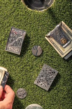 This sterling silver ball marker features an engraved American flag on one side and our classic scroll engraving on the back.
