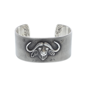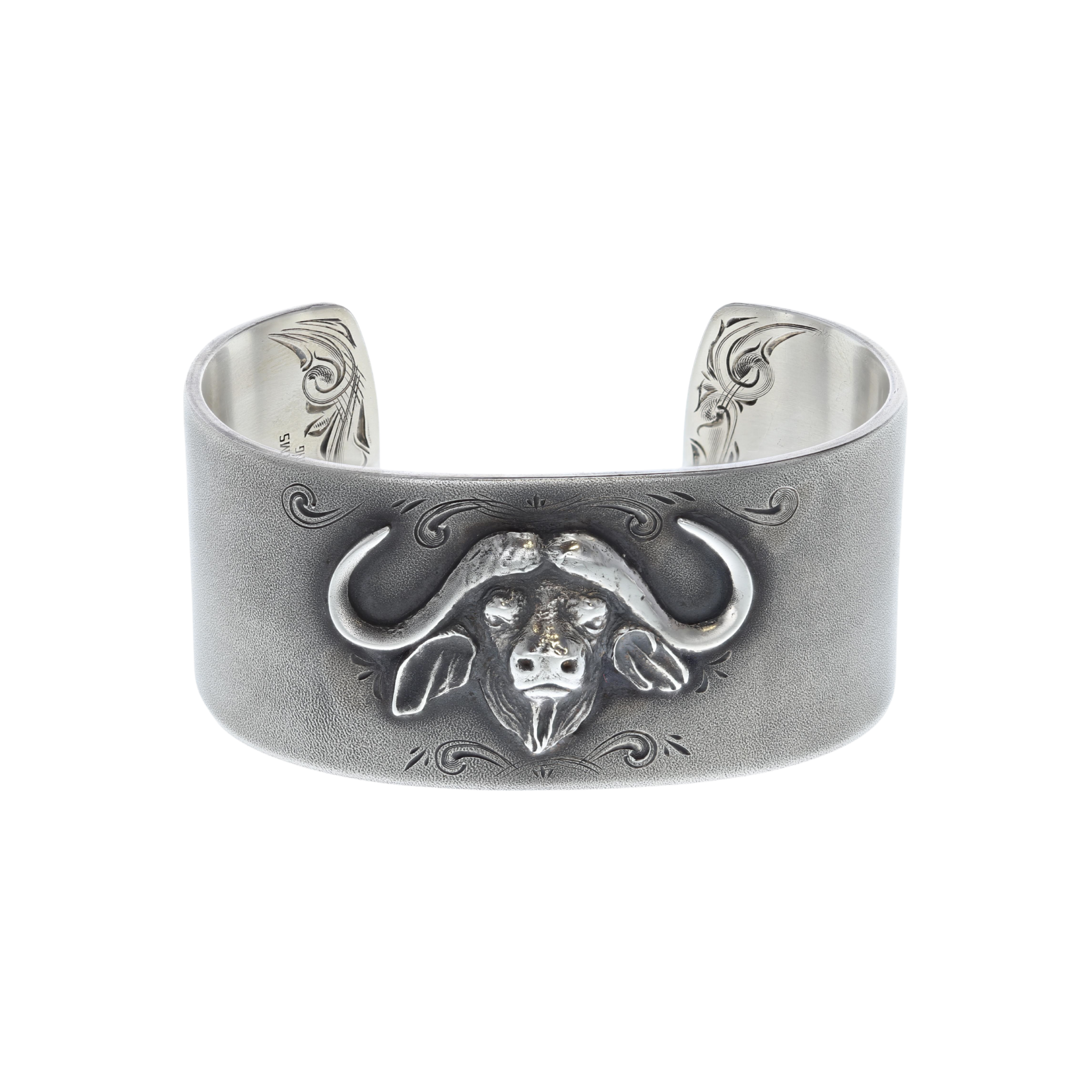 This 1.25" wide sterling silver bracelet features a prominent sterling silver cape buffalo centerpiece, complemented by a sandblasted finish and finely engraved accents on the ends. Made and engraved by hand in Texas by Clint Orms Engravers & Silversmiths.