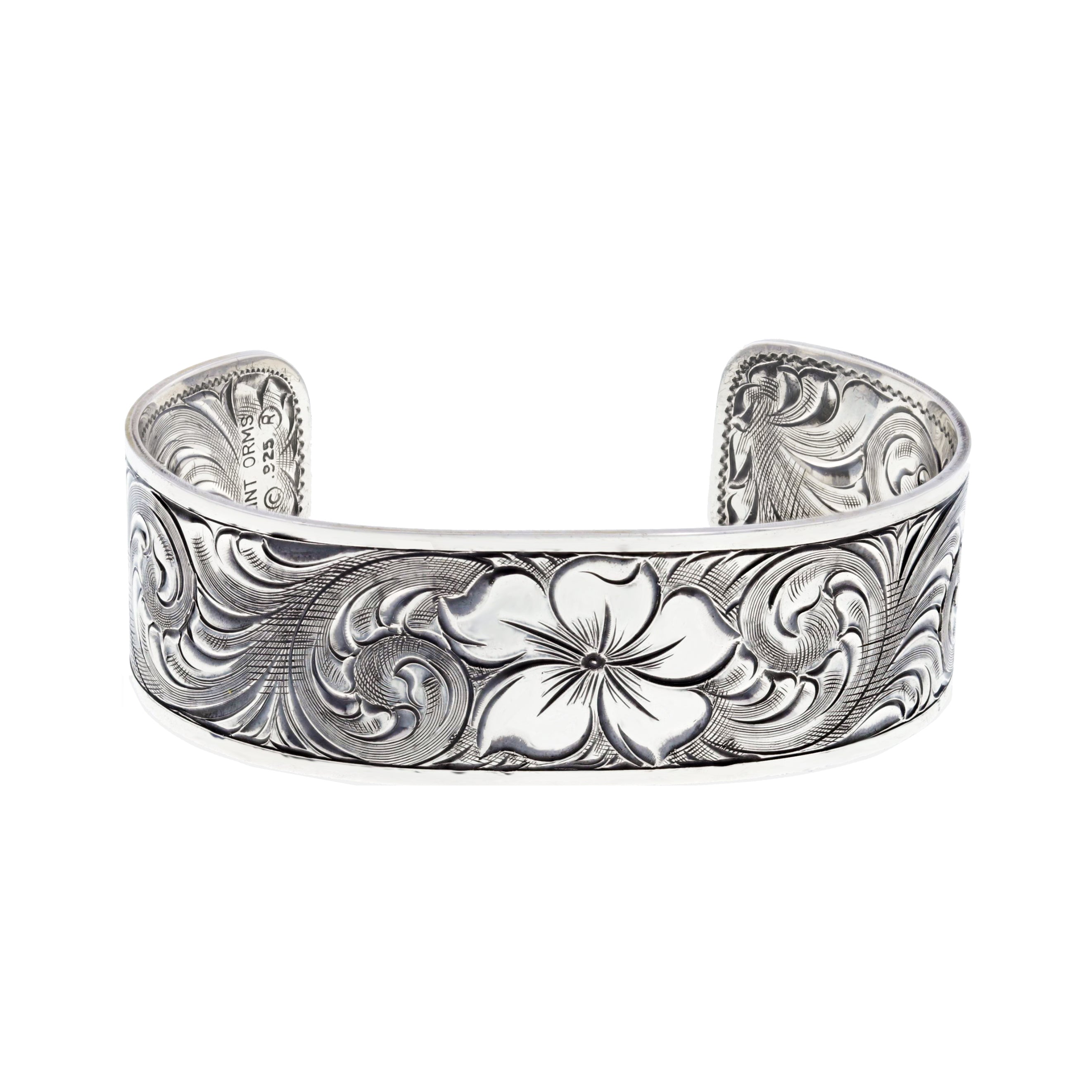 Bracelet 1858 is a 0.8" wide sterling silver cuff bracelet with a flower hand engraved in center and scroll engraving throughout.