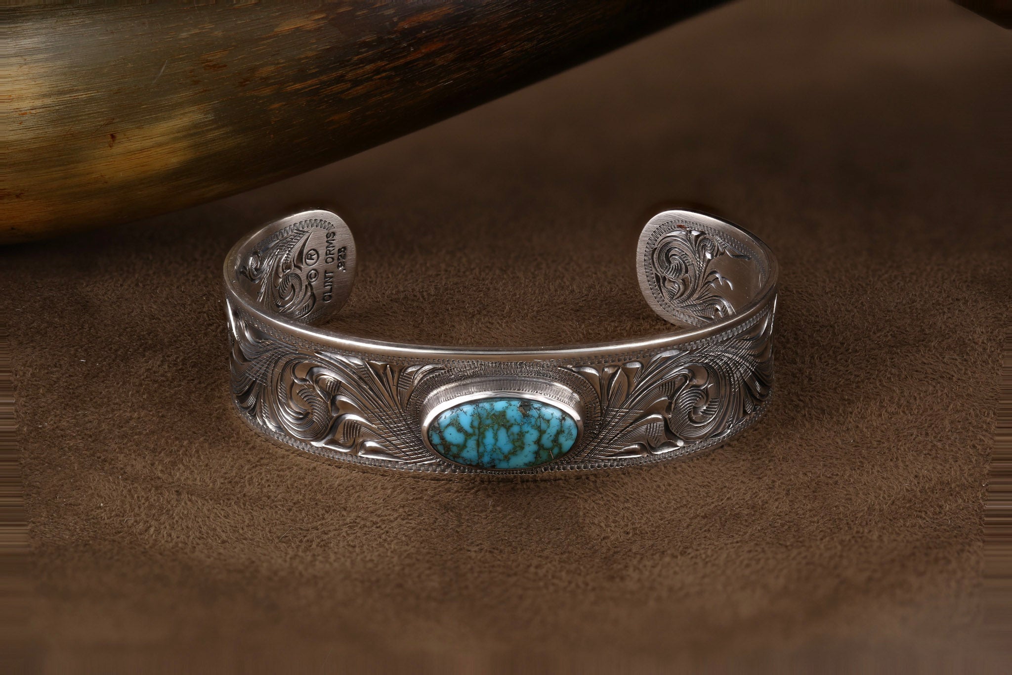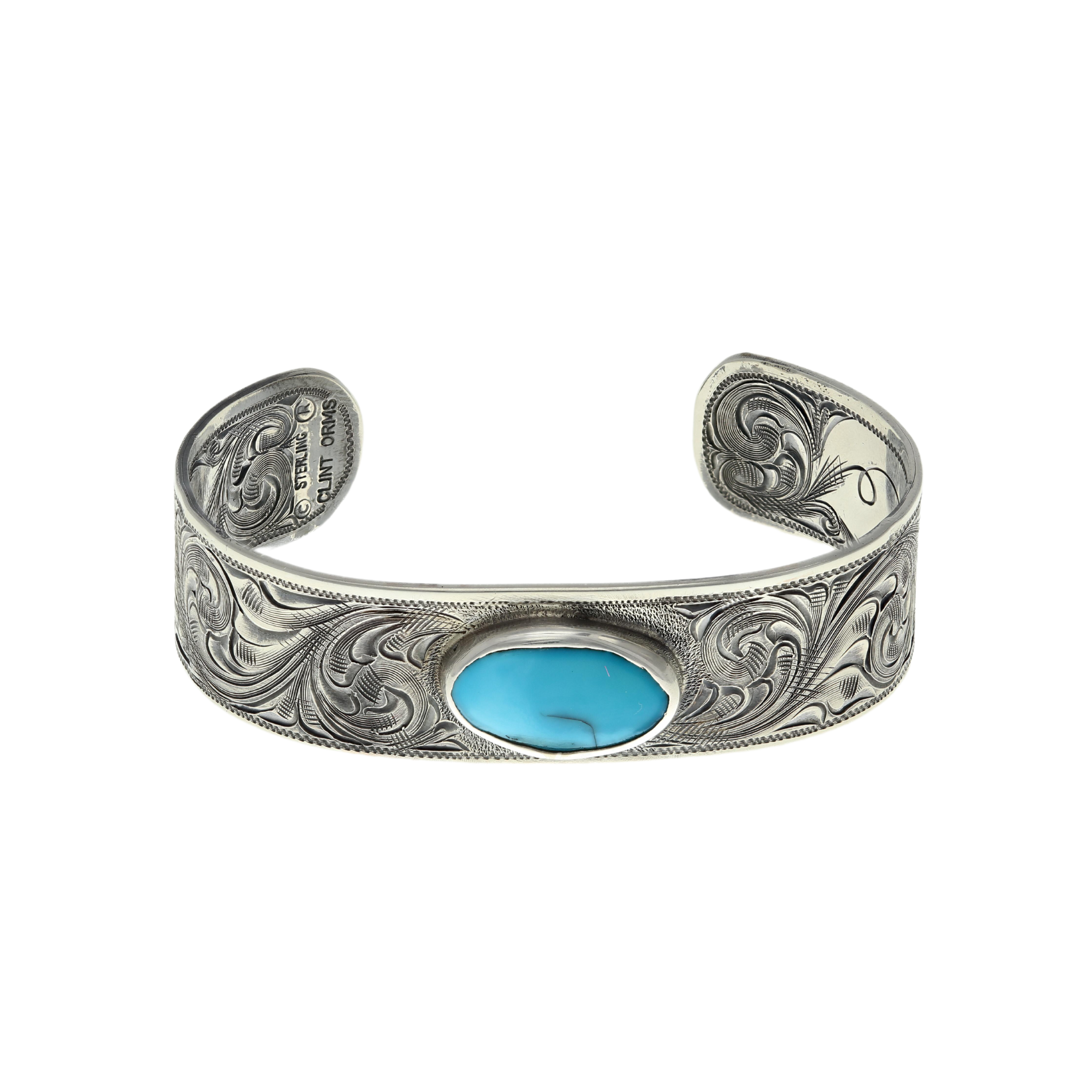 Sterling Silver Bracelet hand engraved featuring a oval turquoise stone in sterling silver bezel.