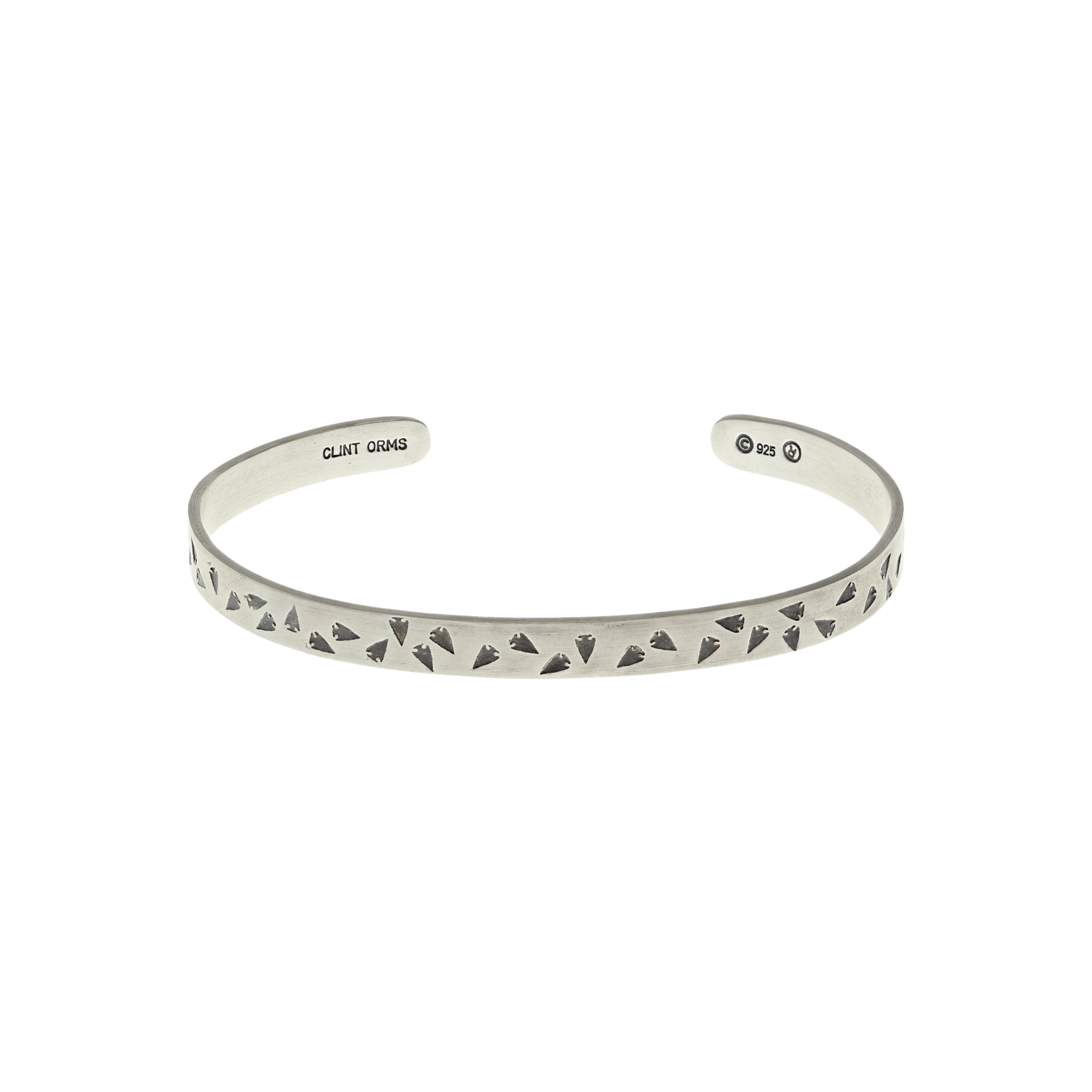 0.25" wide sterling silver bracelet with small stamped arrowheads. Matte Finish. Made and engraved by hand in Texas by Clint Orms Engravers & Silversmiths.