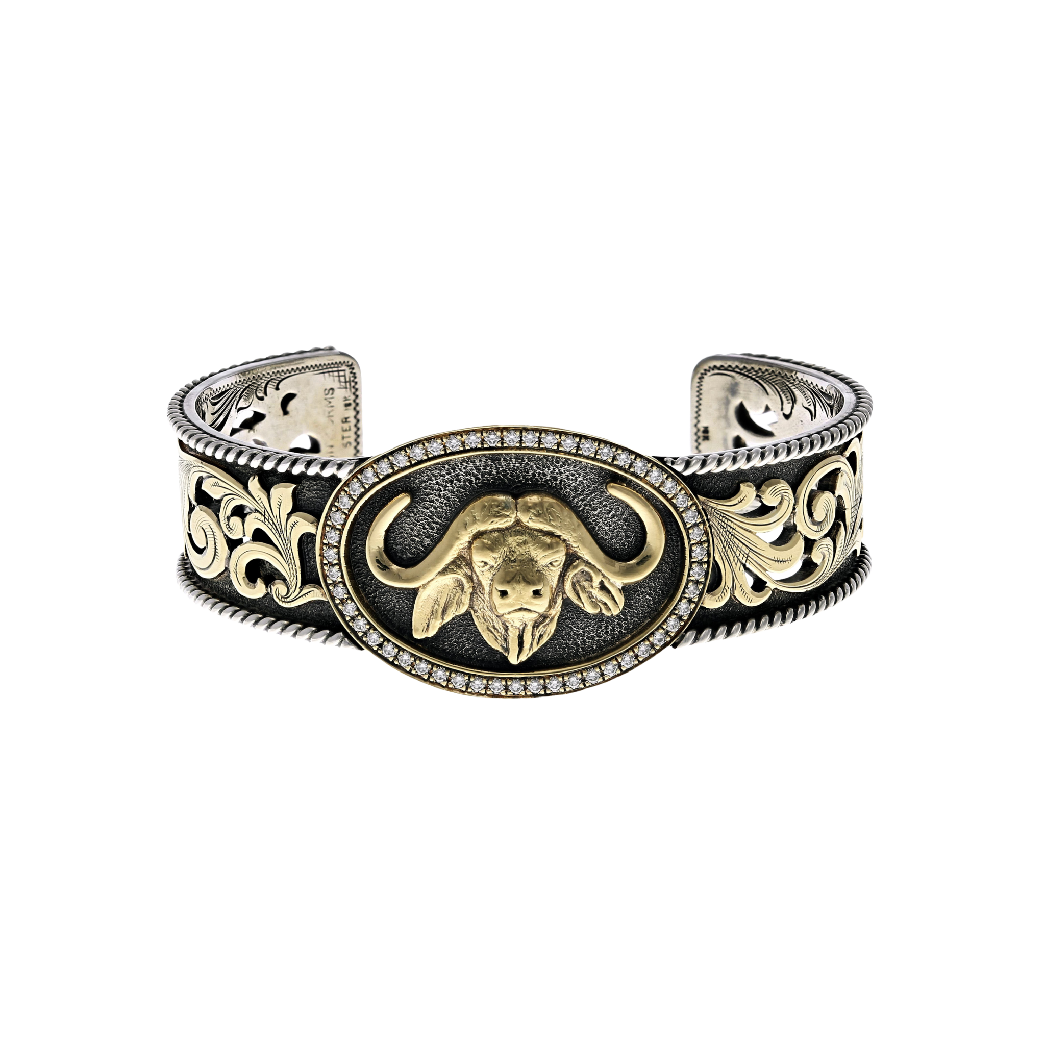 0.70" sterling silver bracelet with 18k yellow gold filigreed overlays, 18ky large cape buffalo, 18g ss rope edge, (51) 1.5mm diamonds, stippled background.