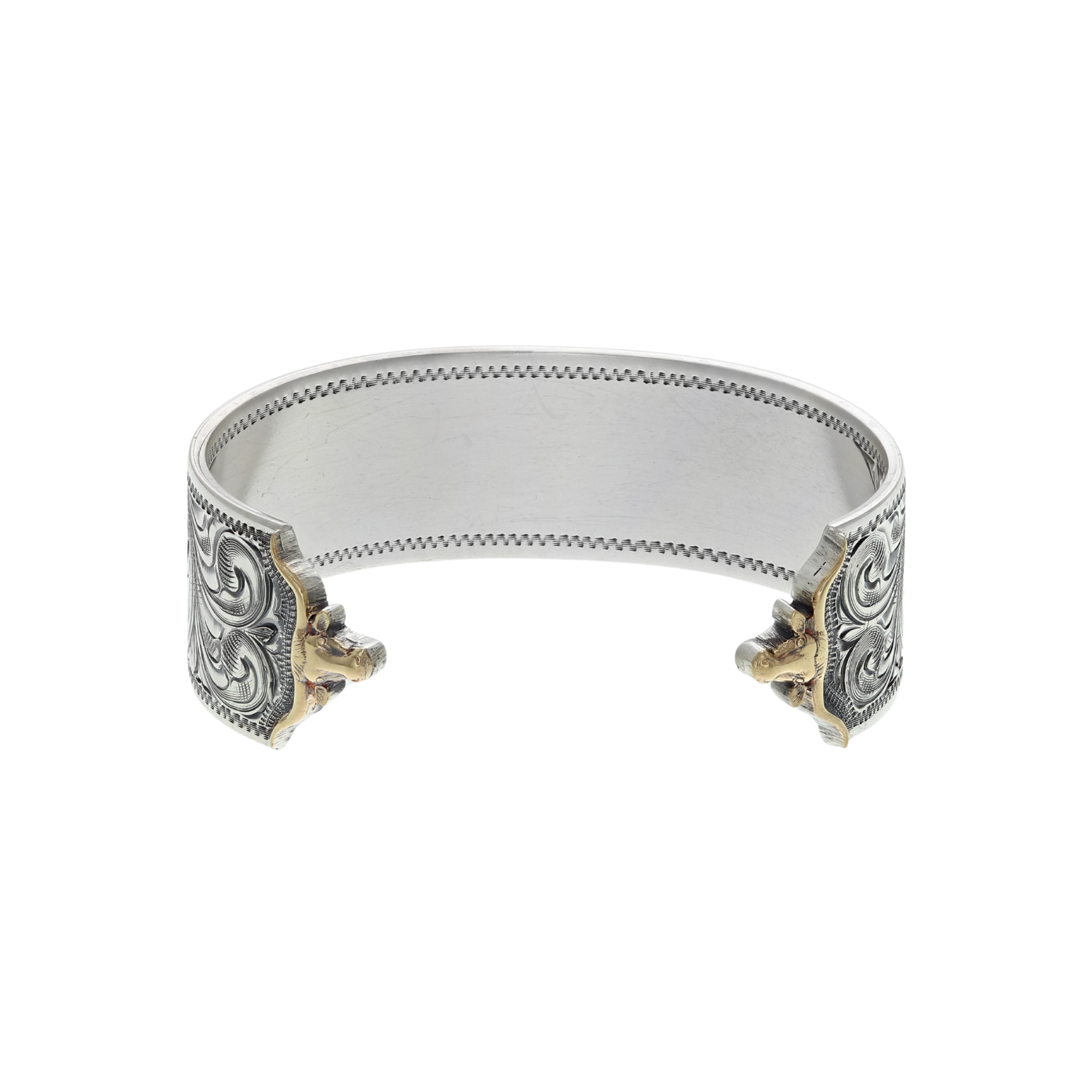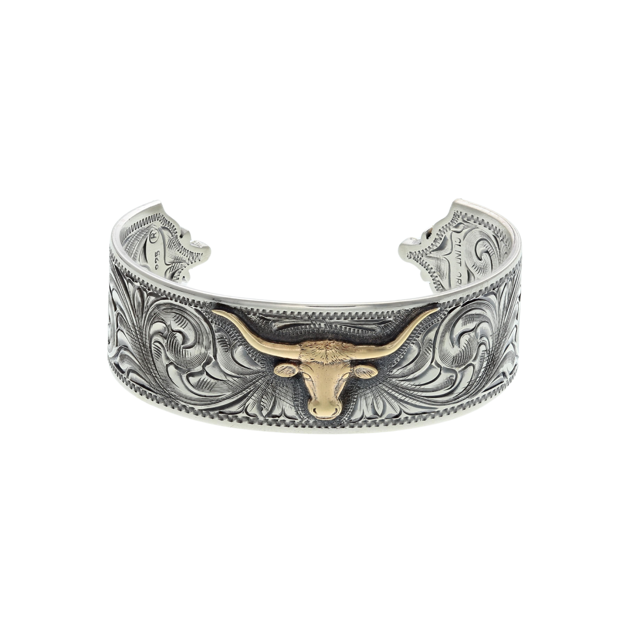 75" wide sterling bracelet with a 14 karat yellow longhorn in center and 14 karat yellow longhorns at each end, engraved. Made and engraved by hand in Texas by Clint Orms Engravers & Silversmiths.