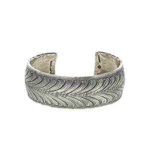 16 gauge sterling silver cuff bracelet, .85" width; hammered edge; domed; double leaf pattern. Made and engraved by hand in Texas by Clint Orms Engravers & Silversmiths.