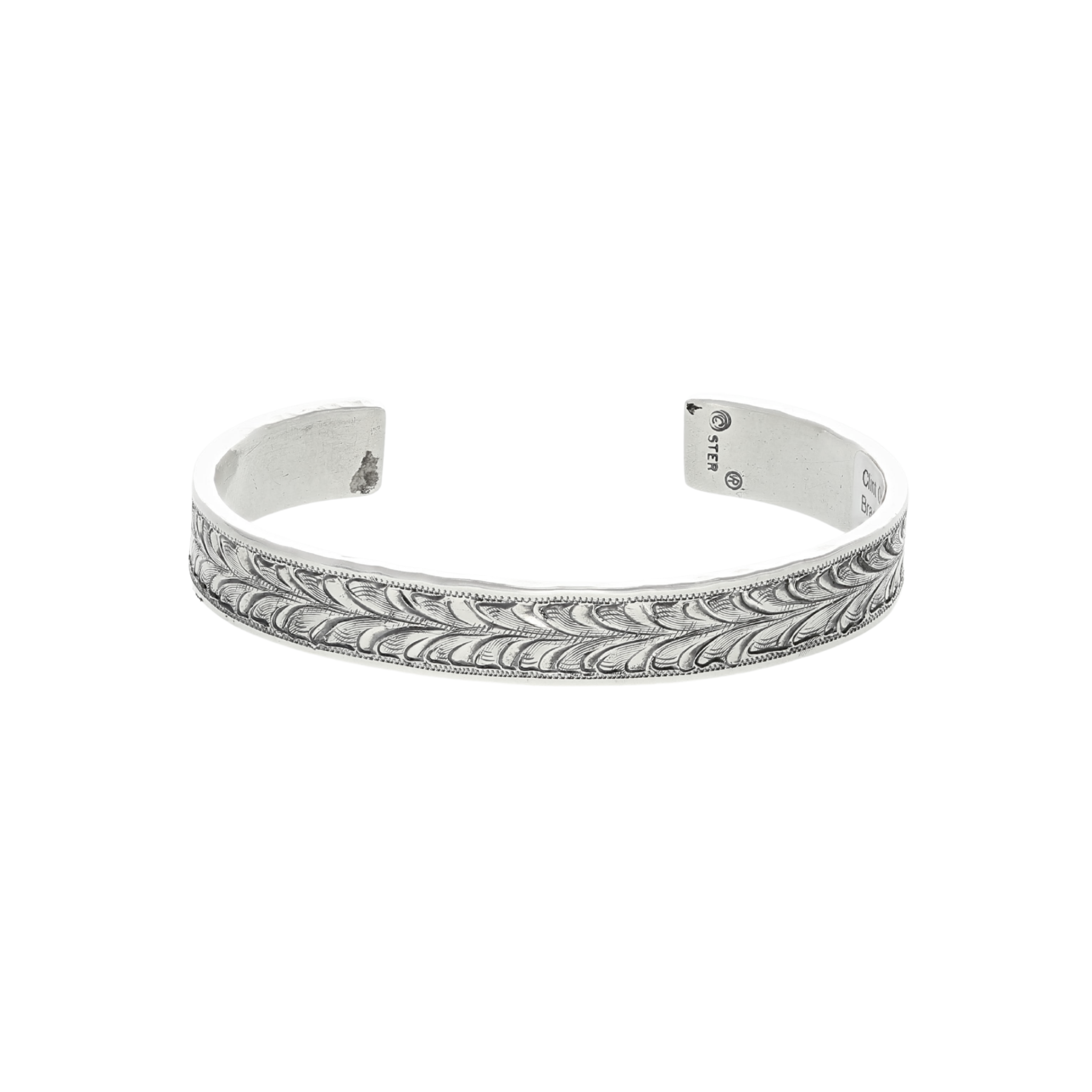.37" 12 gauge sterling silver cuff bracelet with hammered edge; double leaf pattern engraved. Made and engraved by hand in Texas by Clint Orms Engravers & Silversmiths.