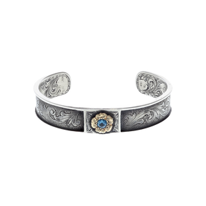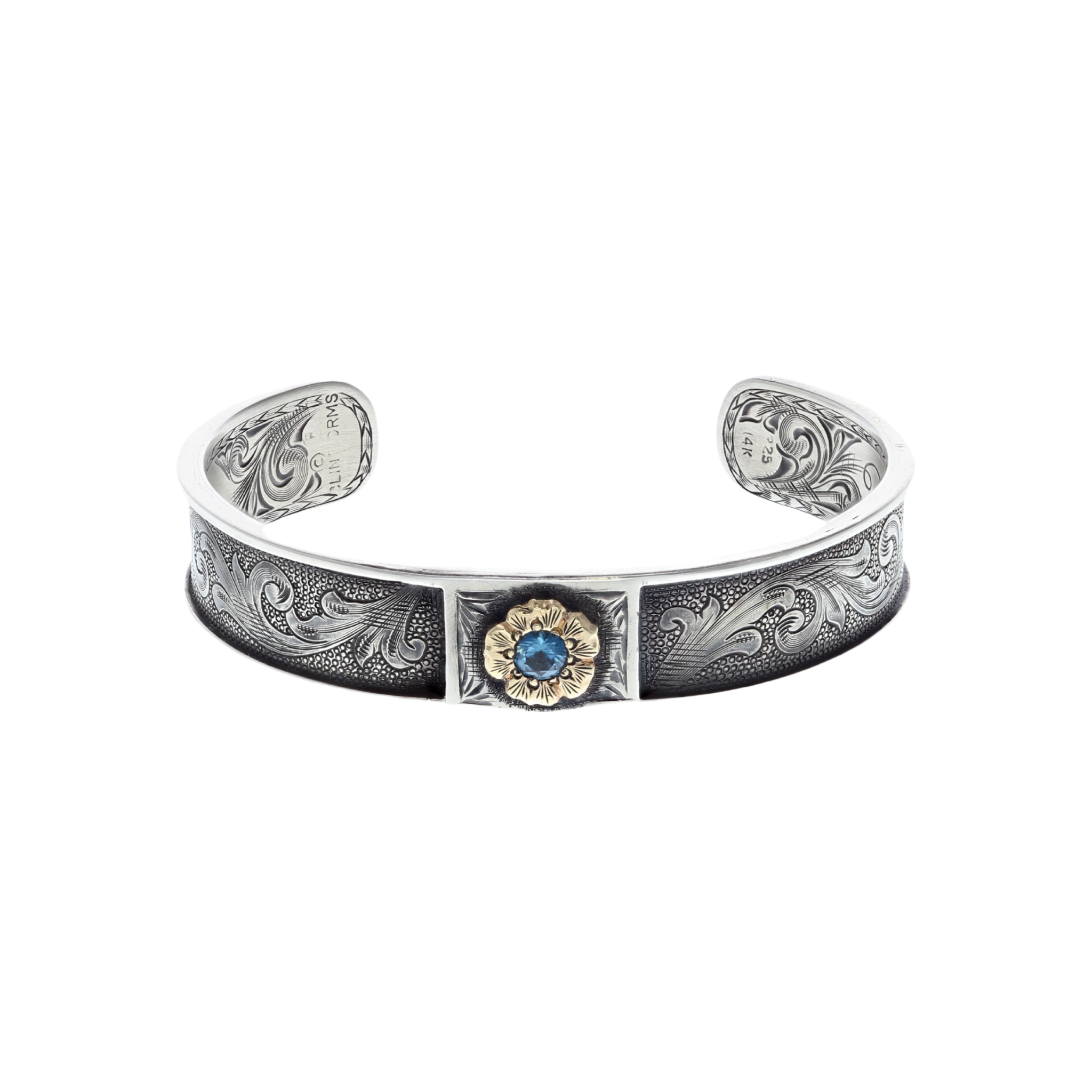 Bracelet 2111 Gun Engraved Sterling with Rose Gold Rosette and Blue Topaz