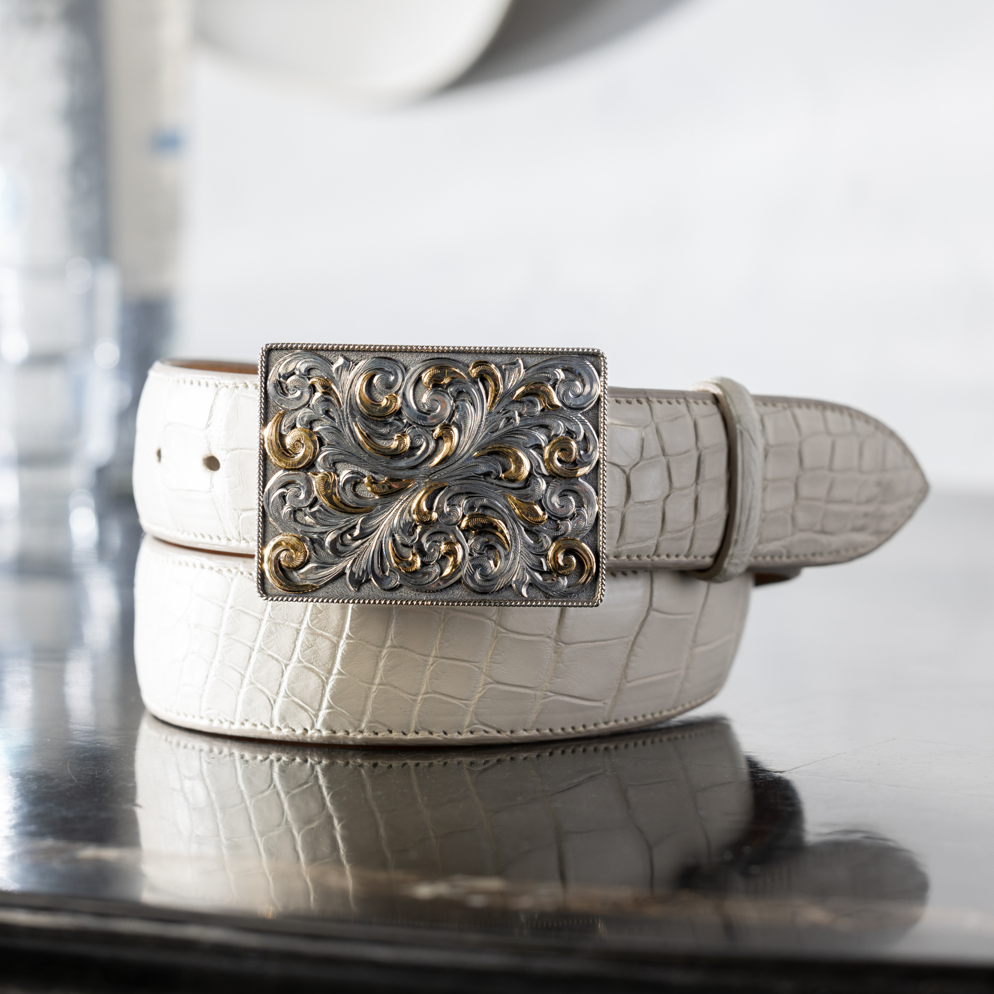 Wear the versatile Brandes 1805 with a gown as a high-fashion accessory or with one of our premium 1.5" straight alligator belts, jeans, and a blazer for everyday wear. Made and engraved by hand in Texas by Clint Orms Engravers & Silversmiths.
