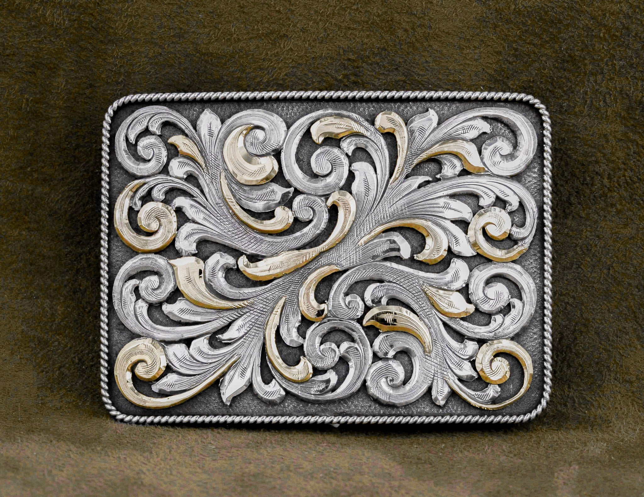 The Brandes 1805 trophy buckle showcases an exquisitely detailed overlay in sterling silver and 14-karat gold. This silver and gold belt buckle is traditional in shape and size but luxurious in detail. A handmade 20-gauge silver rope border frames the intricate silver and gold overlays for added interest.