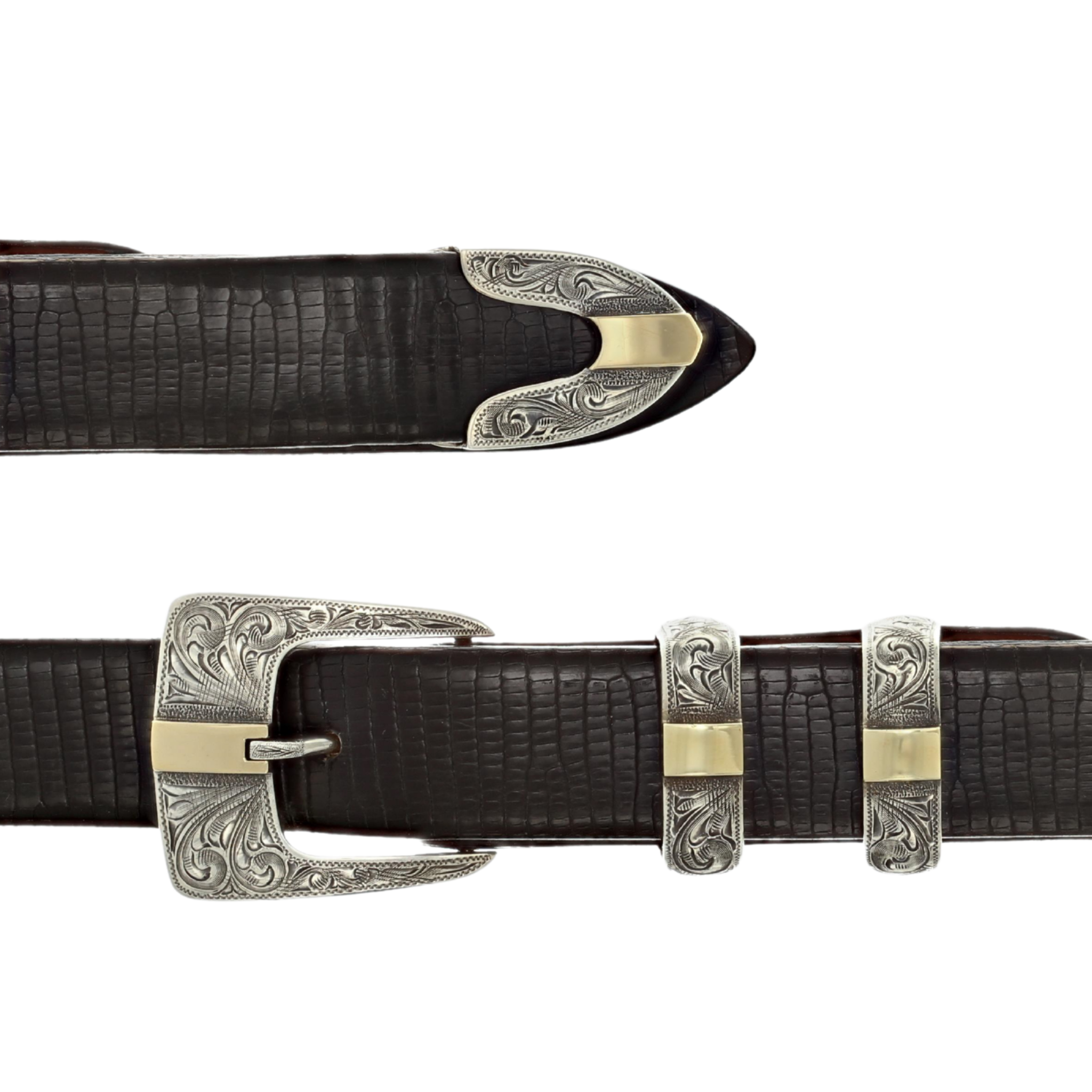 The engraved Clay 1804 Sterling Silver Buckle Set With 14 Karat Yellow Gold Bars features a 1” sterling silver buckle set with narrow loops and 14 karat yellow gold bars running through the center of each of the four intricately engraved pieces. This entire sterling silver buckle set has been handmade and engraved with special attention to detail.