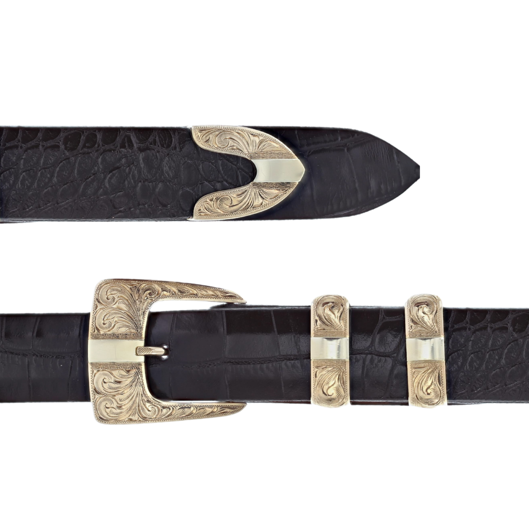 TheClay 1818 1" Buckle Set is a stunning example of fine craftsmanship and elegant design. This exquisite four-piece set features narrow loops and is crafted from 14-karat yellow gold, complemented by striking 14-karat green gold bars. Each piece is beautifully engraved, adding a layer of sophistication and artistry. Perfect for those who appreciate timeless elegance, this buckle set elevates any outfit with its unique blend of materials and intricate detailing.Made and engraved by hand in Texas by Clint Orms Engravers & Silversmiths.