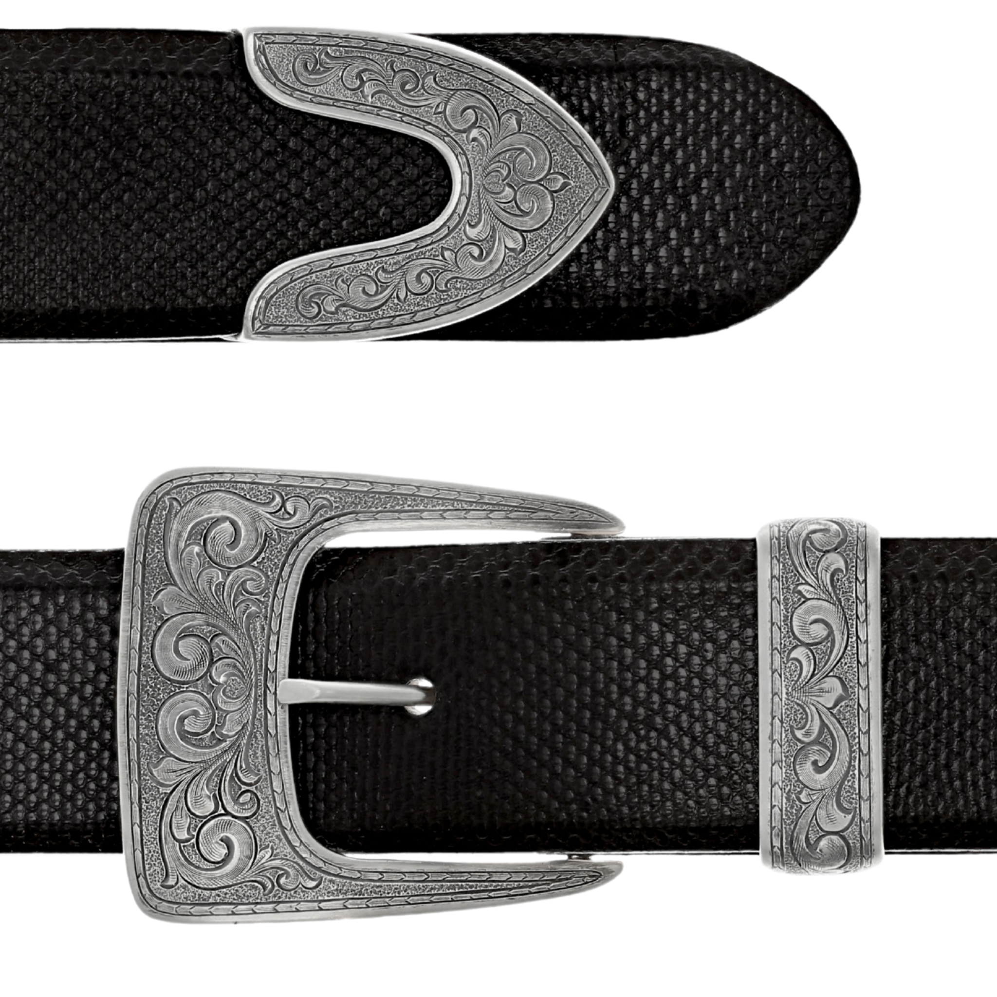 1 1/2" three piece sterling silver buckle set with engraving, matte finish. Fits on a 1 1/2" belt. Made and engraved by hand in Texas by Clint Orms Engravers & Silversmiths.