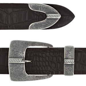 1-1/2" three piece sterling silver buckle set with sterling silver square wire and rope in the center of each piece. Wheatgrass engraved.