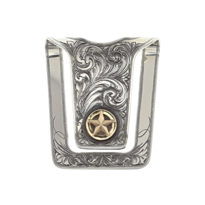 Large sterling silver money clip with 14 karat yellow star, engraved. Made and engraved by hand in Texas by Clint Orms Engravers & Silversmiths.