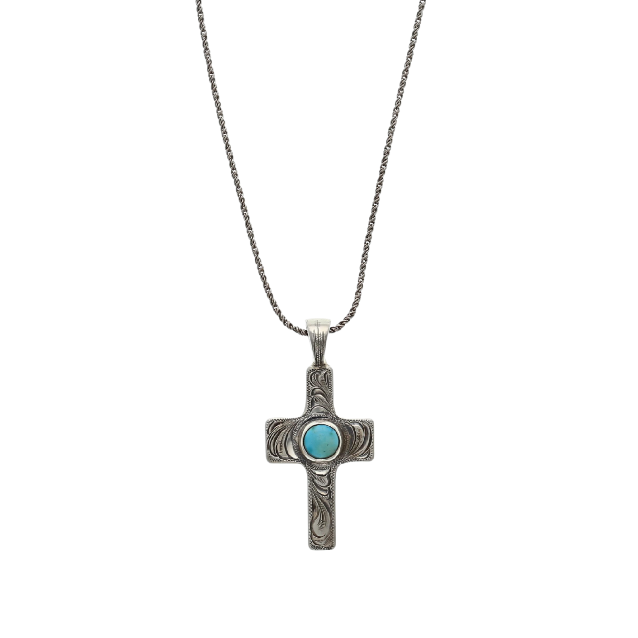 Sterling Silver cross pendant, 1.5" x .9", with small turquoise stone in bezel, engraved. Made and engraved by hand in Texas by Clint Orms Engravers & Silversmiths.