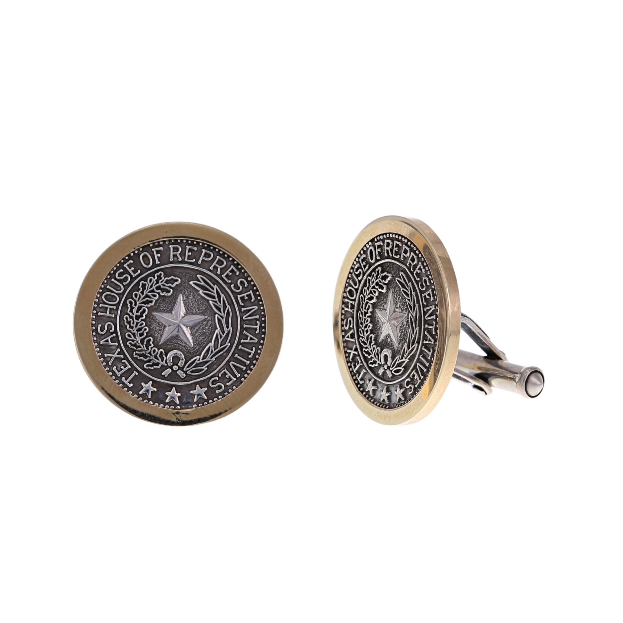 1" round sterling silver cuff links with "Texas House of Representatives" stamped seal, 14k yellow gold boarder, engraved backs.