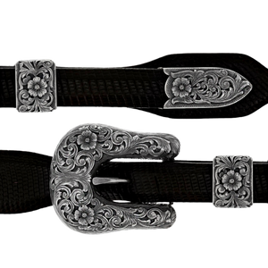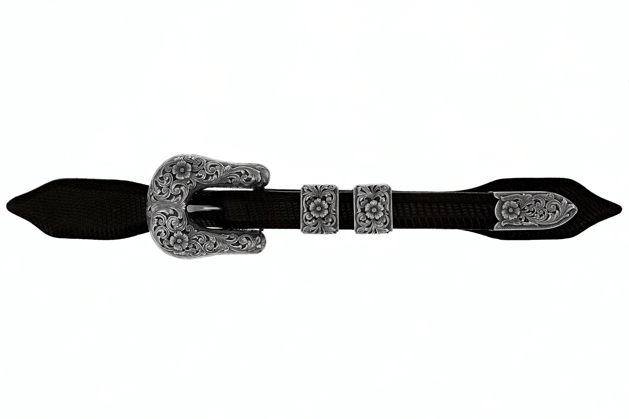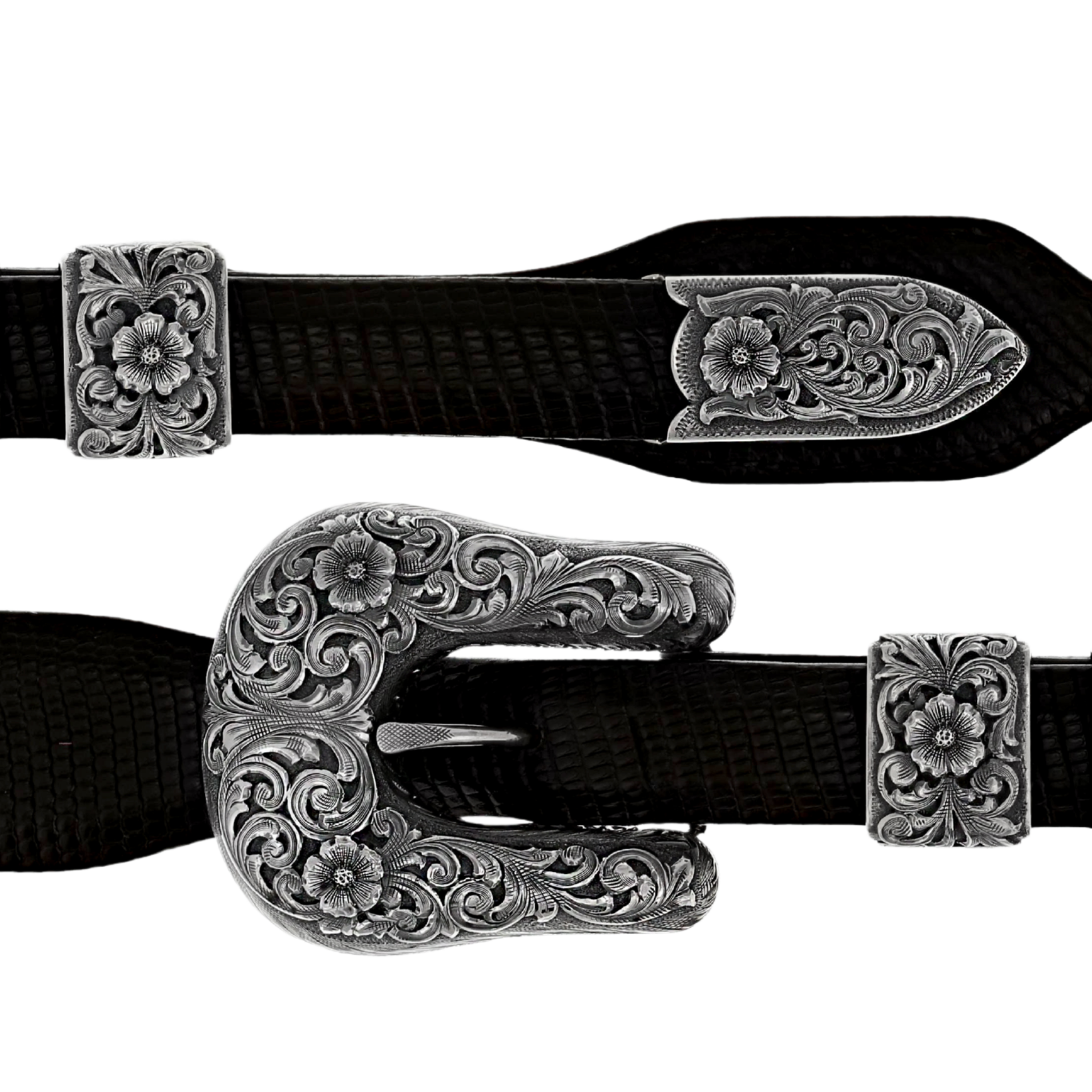 .75" sterling silver buckle set with sterling silver overlays and five sterling flowers. Hand-engraved, 4 pcs.