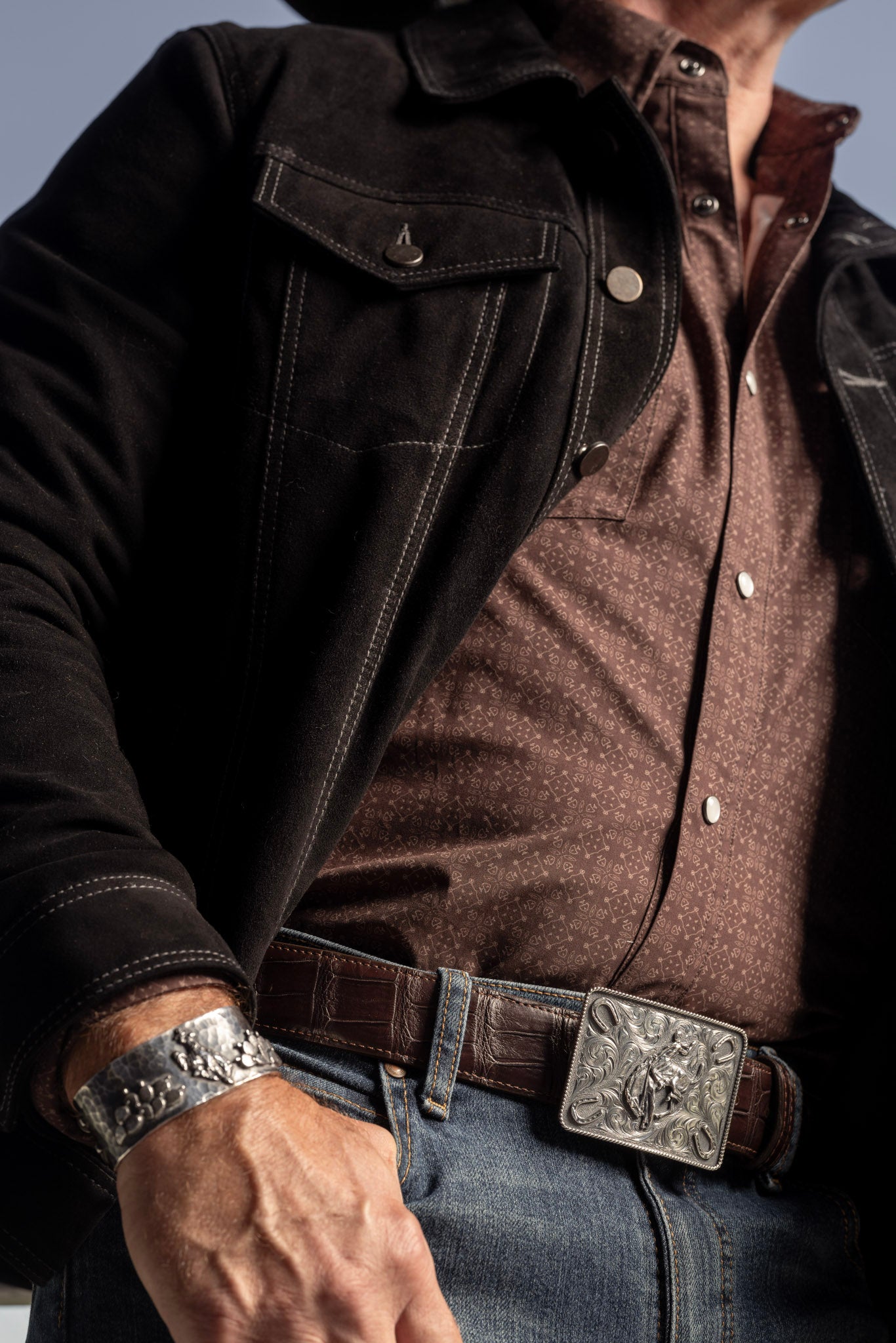The Dimmit 1802 is a sterling silver trophy belt buckle that proudly displays an engraved bucking horse and bronc rider at its center, with horseshoes accenting each corner. An 18-gauge sterling silver rope edge frames the rounded rectangular buckle for a classic Western touch. Made and engraved by hand in Texas, this trophy buckle features Clint Orms’ signature swirling background. Fits belts up to 1.5" wide.