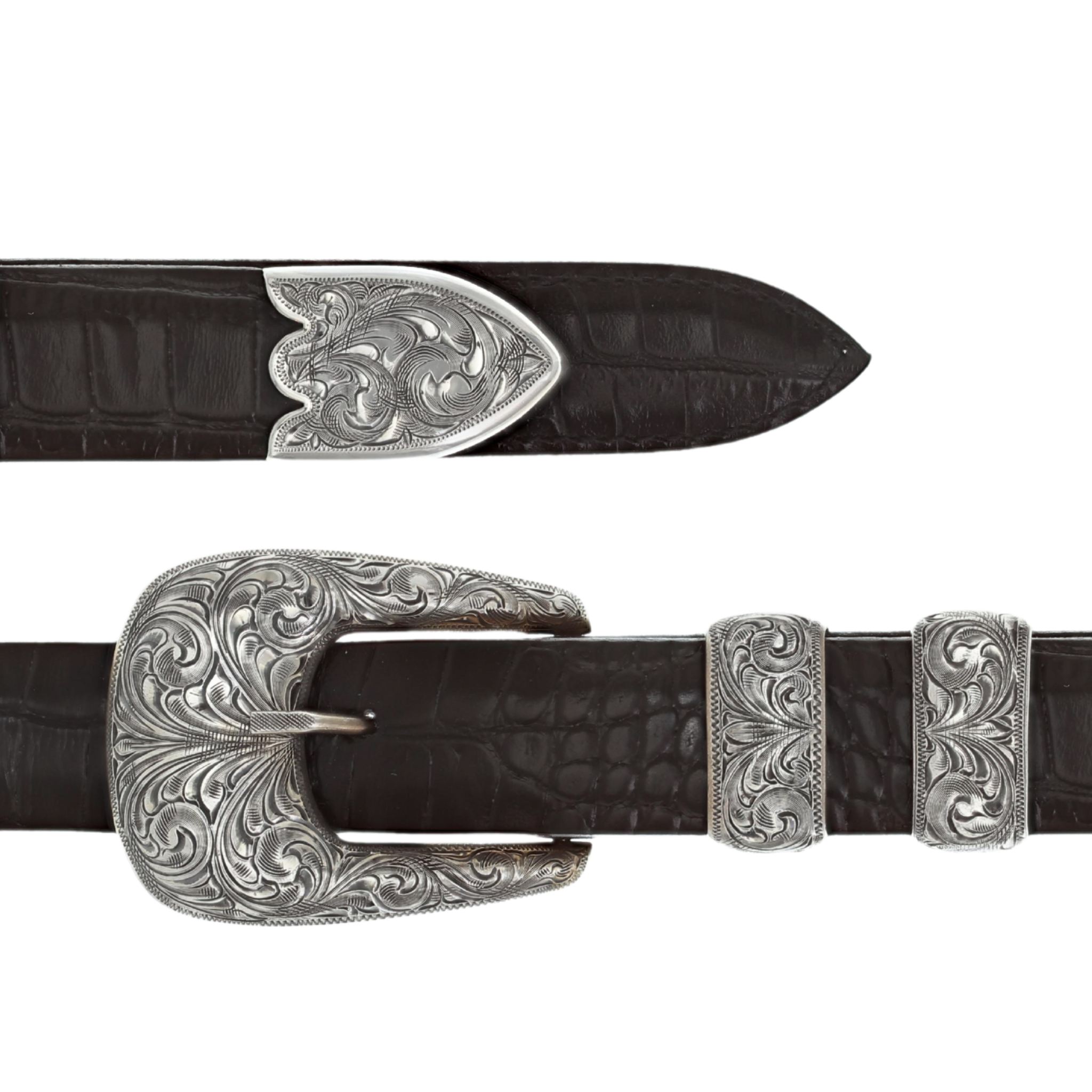 1" sterling buckle set with wide loops, engraved, 4pcs. Made & engraved by hand in Texas by Clint Orms Engravers & Silversmiths.