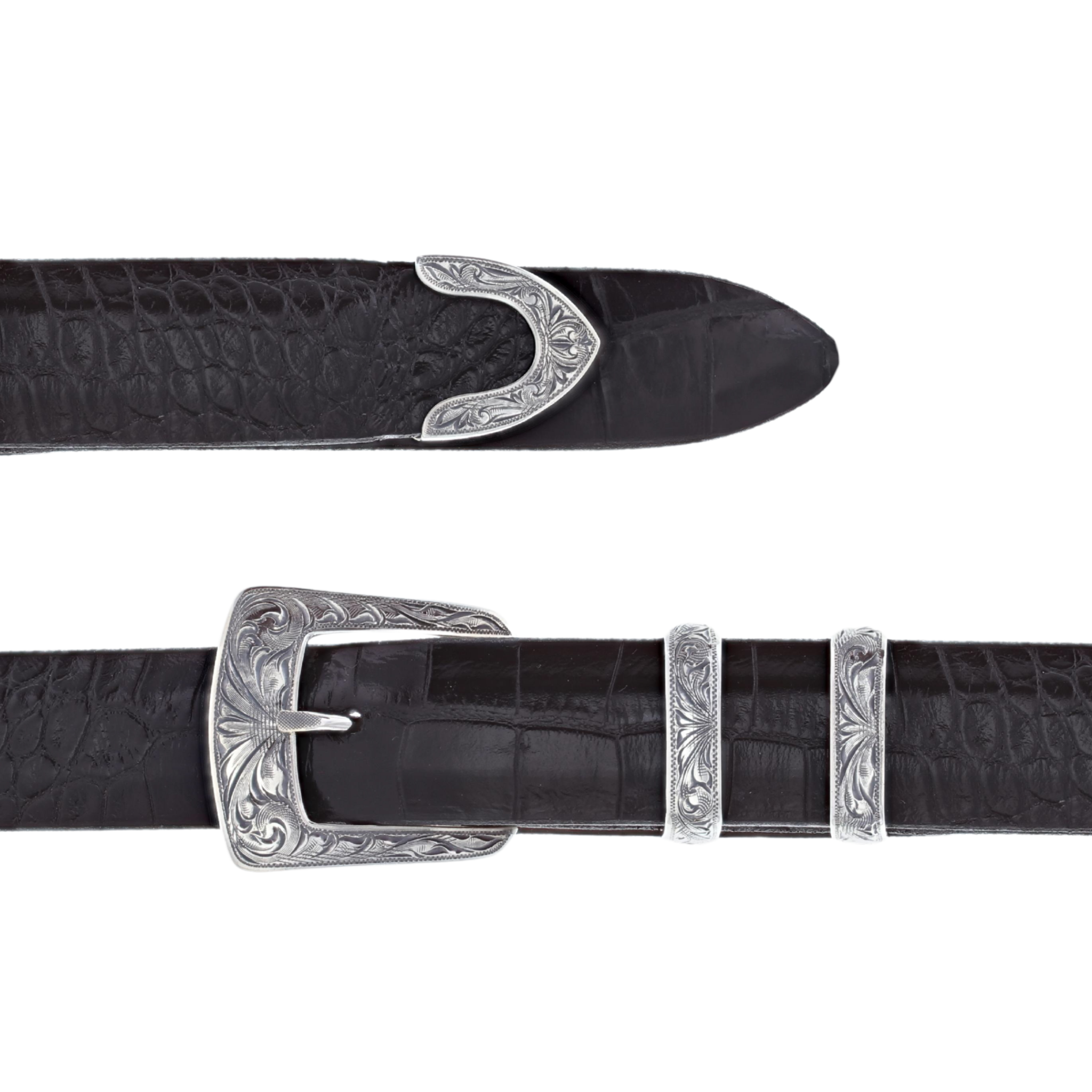 This 1" Galveston 1800 Sterling Silver Buckle Set with scroll engraving is no exception. With four individual pieces, this buckle set is an excellent example of some of our best scroll engraving work. All of the engraving has been done by hand with extreme attention to detail, ensuring that your belt will gain attention and admiration from just about everyone.