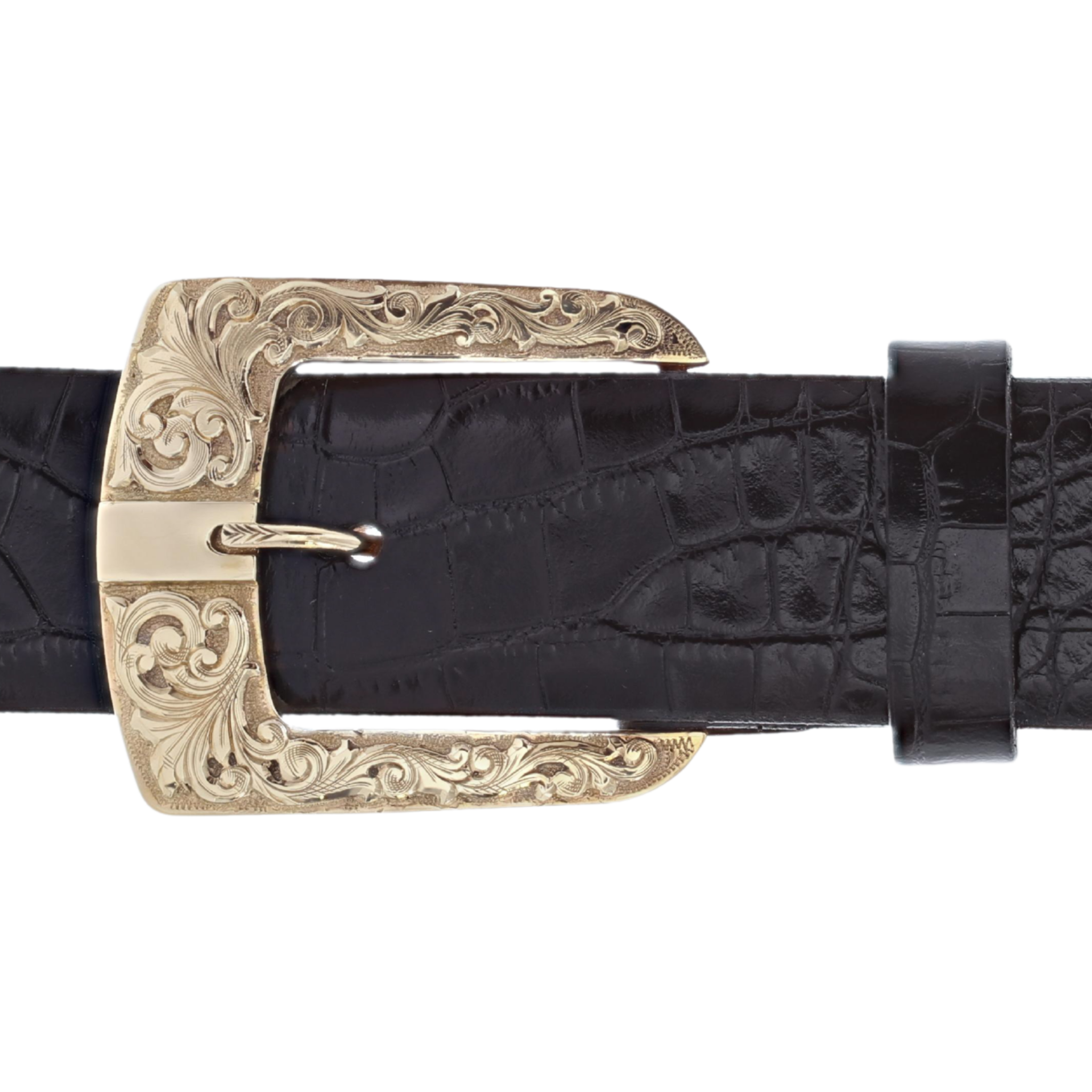 1.5", 14k yellow gold buckle only with 14k yellow gold overlays, engraved. Made and engraved by hand in Texas by Clint Orms Engravers & Silversmiths.