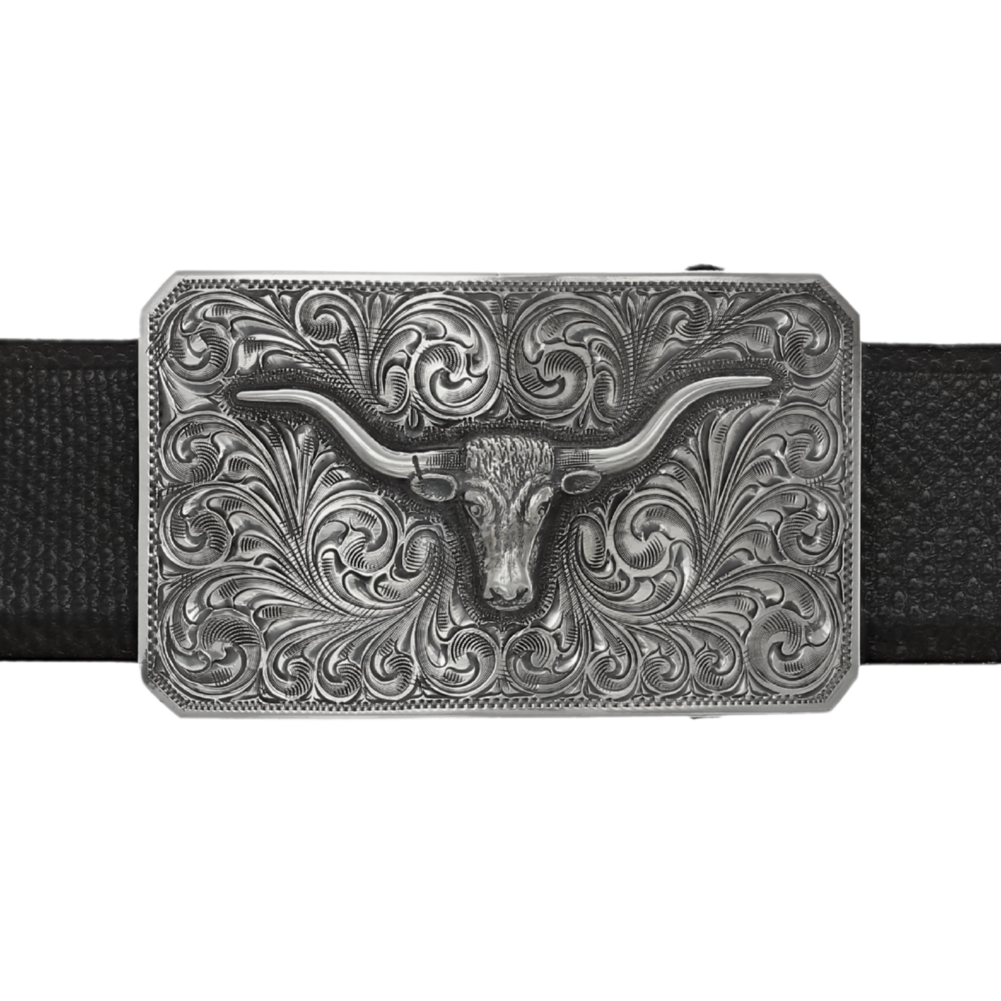 This sterling silver trophy buckle measures 3.25" by 1.97" and features cropped corners. It is adorned with a detailed sterling silver longhorn at its center and finished with elegant scroll engraving. Made and engraved by hand in Texas by Clint Orms Engravers & Silversmiths.