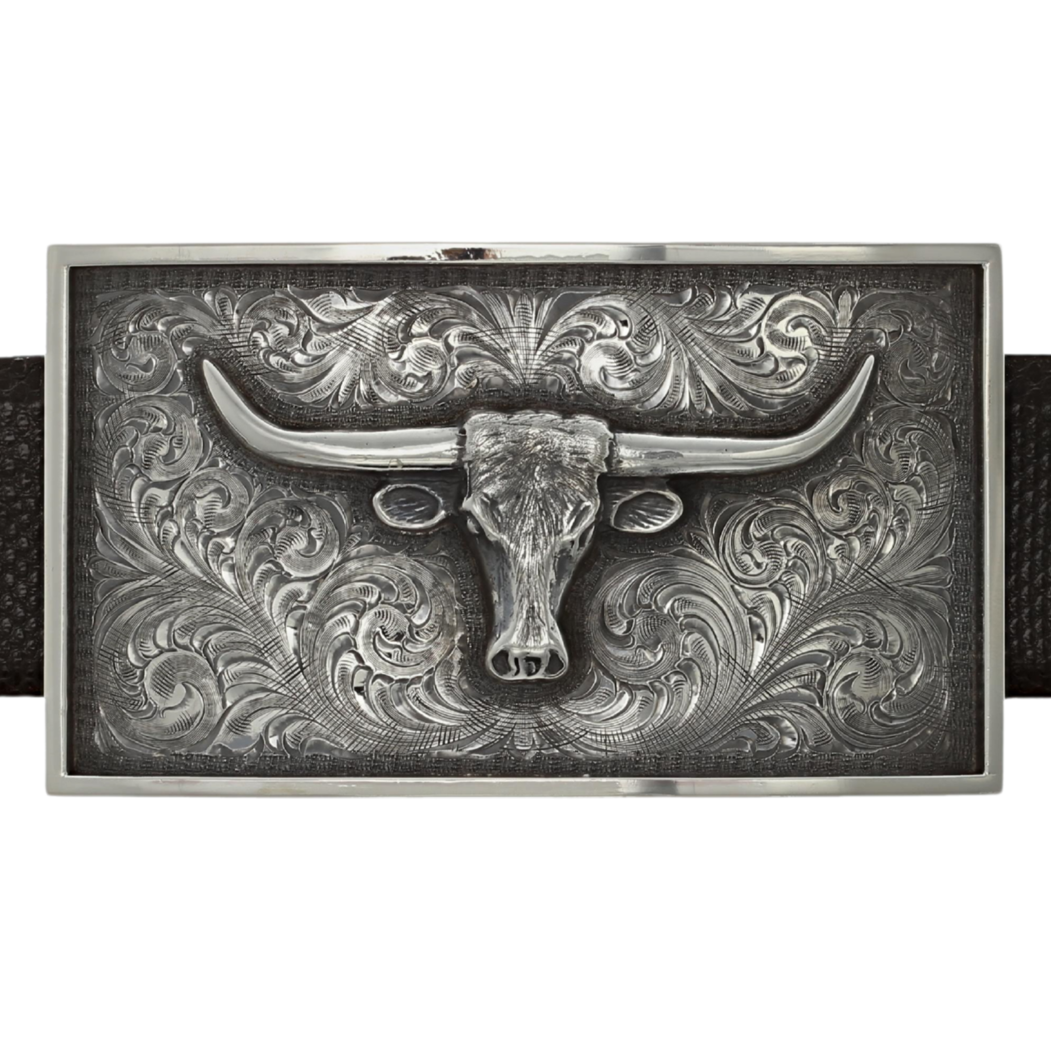 4" x 2.3" trophy buckle, sterling longhorn, sterling square wire edge, engraved. Made and engraved by hand in Texas by Clint Orms Engravers & Silversmiths.
