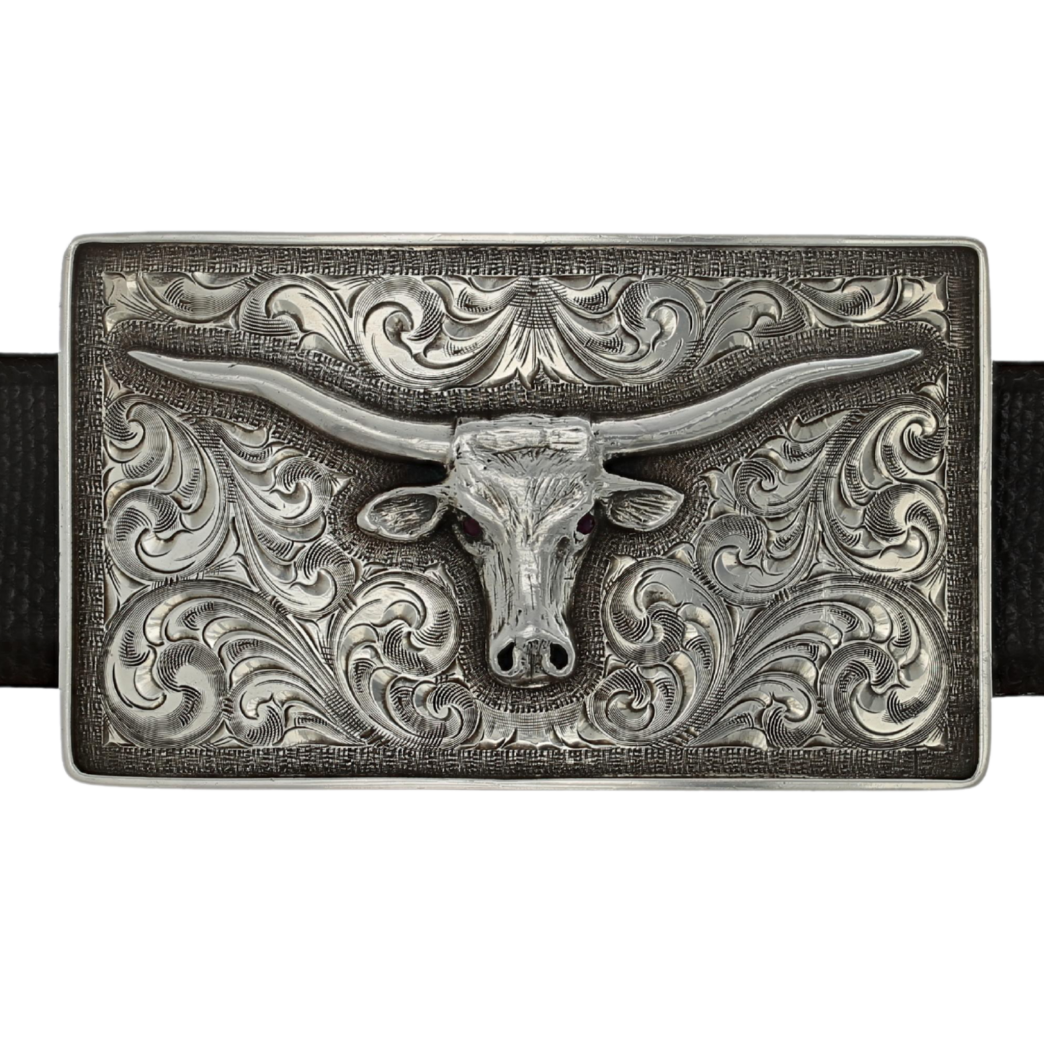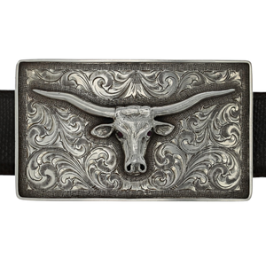4" x 2.3" trophy buckle, sterling longhorn, sterling square wire edge, engraved. Made and engraved by hand in Texas by Clint Orms Engravers & Silversmiths.