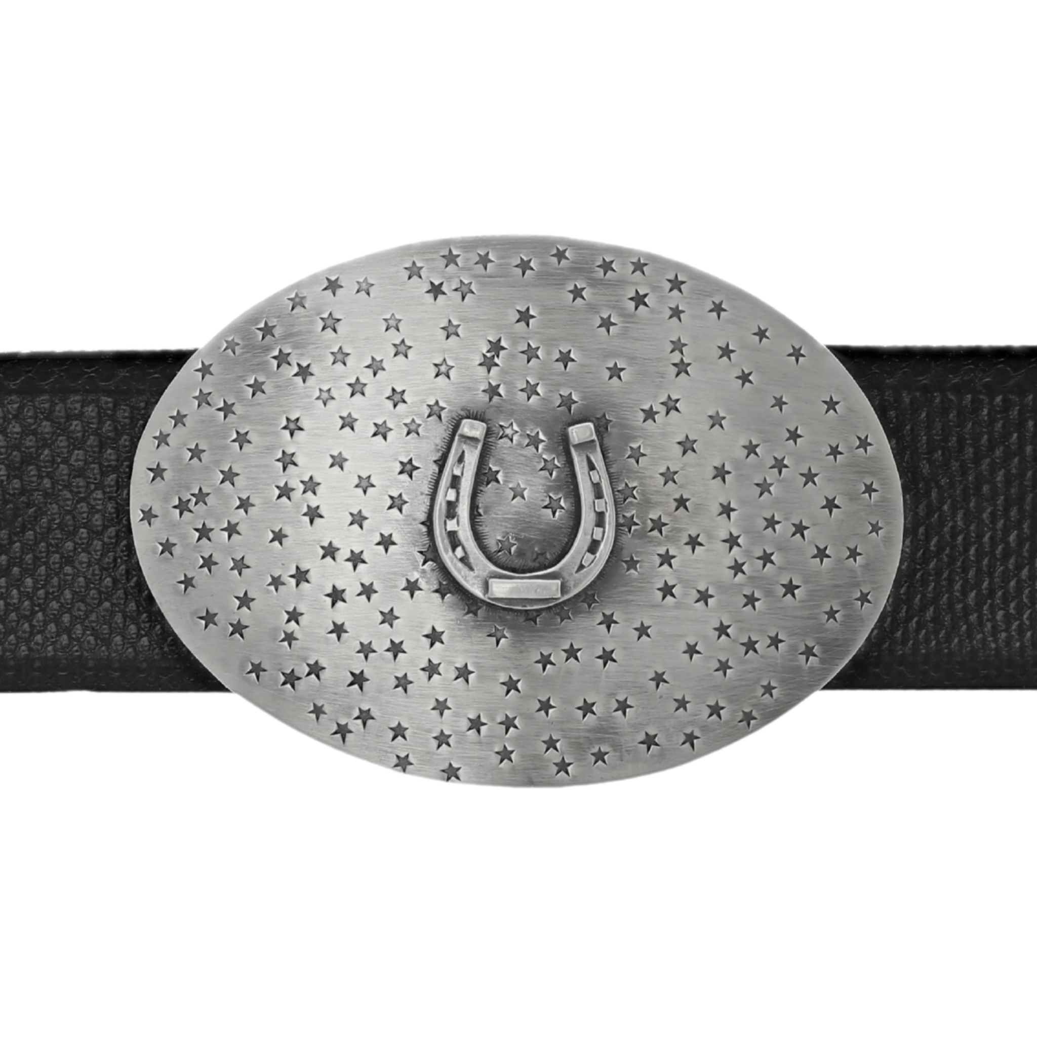 3.25" x 2.30" sterling oval trophy buckle with sterling horseshoe in center, star stamped background. Matte Finish. Made and engraved by hand in Texas by Clint Orms Engravers & Silversmiths.