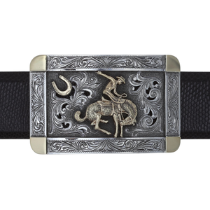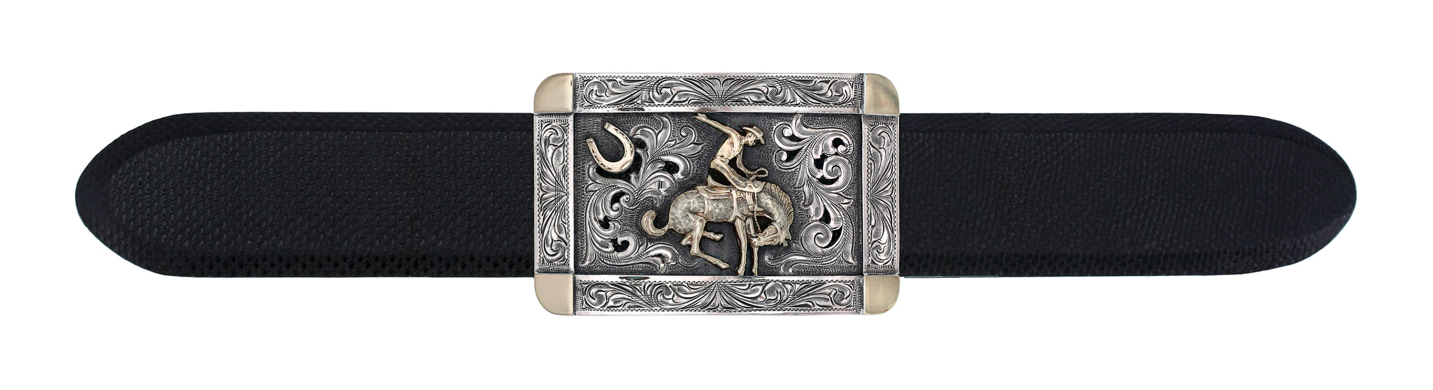The Misty Valley 1800 is a 3.25" x 2.10" sterling silver trophy buckle with 14 karat yellow corners, 14 karat yellow horseshoe, and a 14 karat yellow bronc rider on a filigreed & scroll engraved buckle. 1.5" hinged back that fits belts up to 1.5" wide. Made and engraved by hand in Texas by Clint Orms Engravers & Silversmiths.
