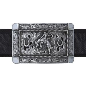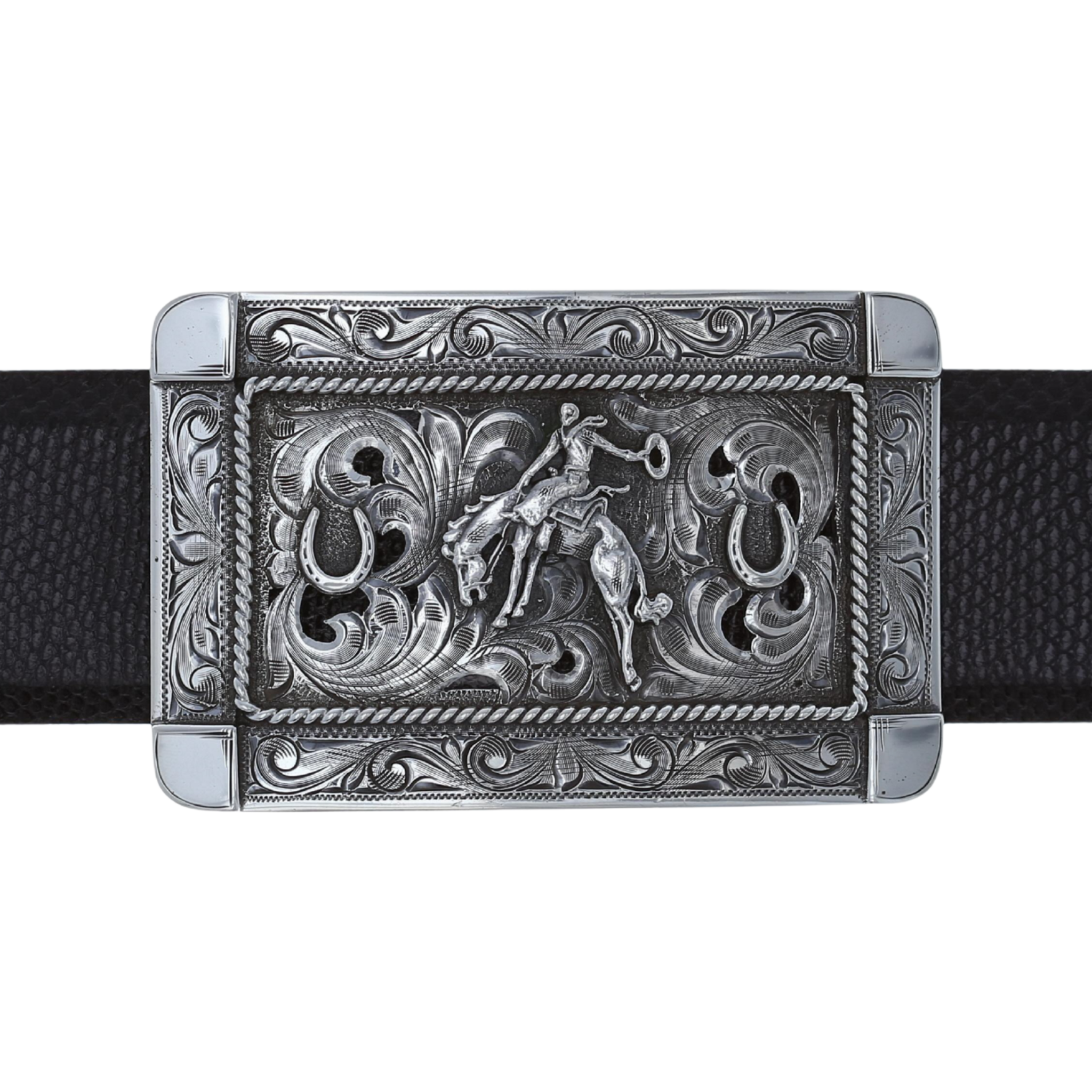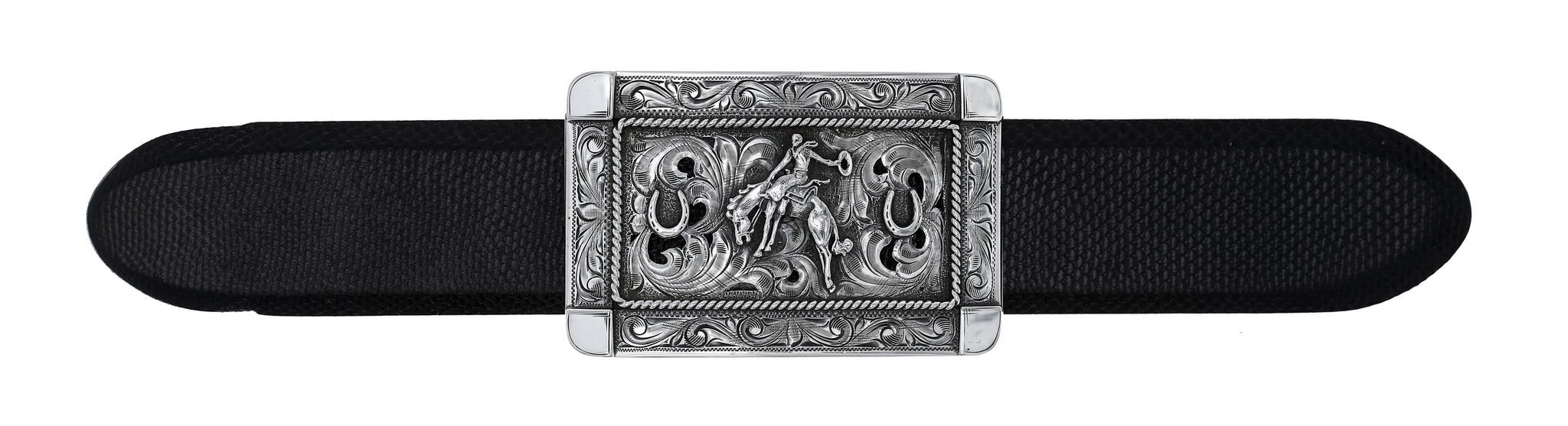 Misty Valley 1808 3.25" x 2.10" sterling silver trophy buckle has a bronc rider and two horseshoes on a filigreed and scroll engraved base.Made and engraved by hand in Texas by Clint Orms Engravers & Silversmiths.
