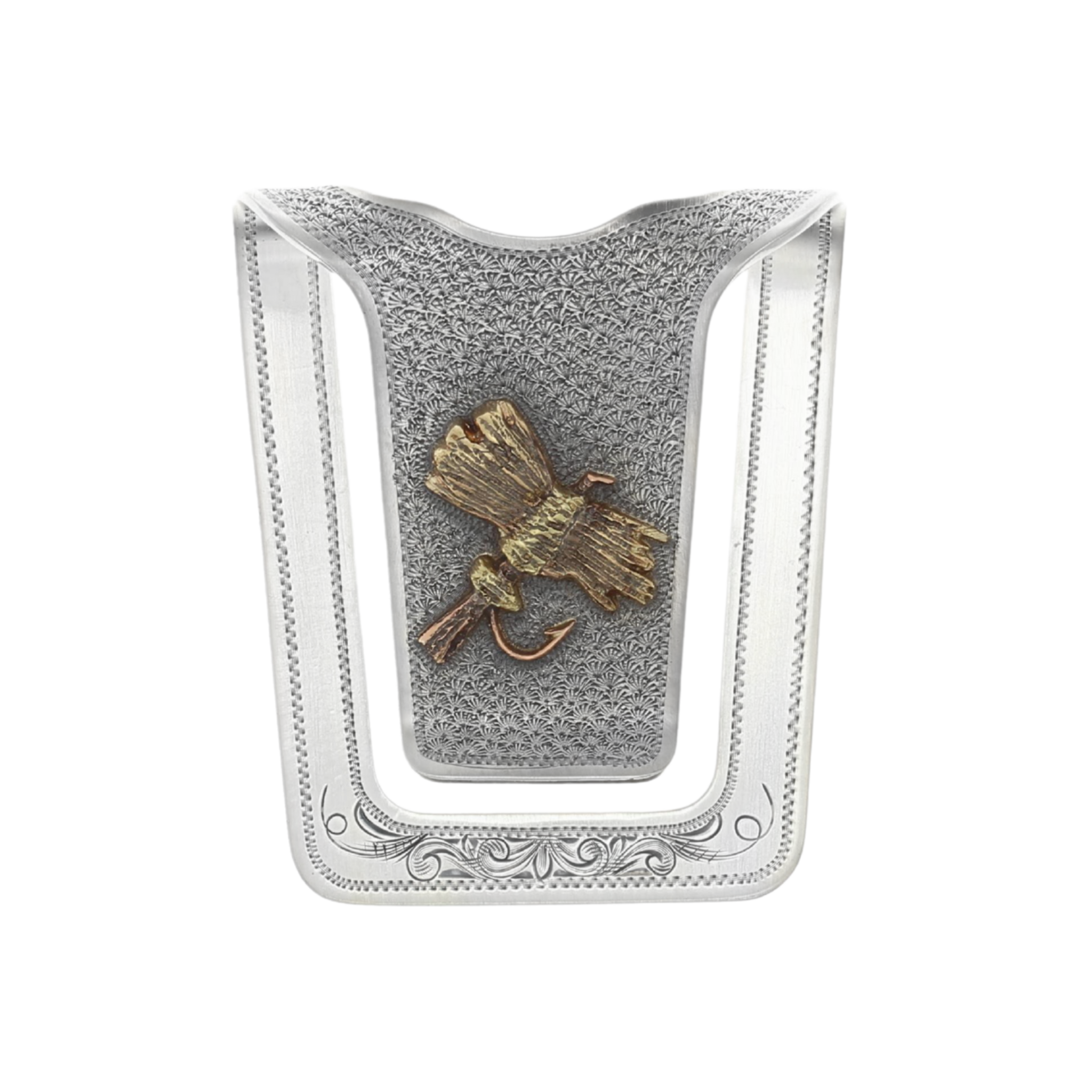 The San Augustine is our largest signature money clip. San Augustine 1603 is sterling silver wheatgrass engraved featuring a 14 Karat tri-gold Fly.  All of our signature money clips are easily adjustable and can be re-tightened over time for varying carry needs.