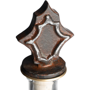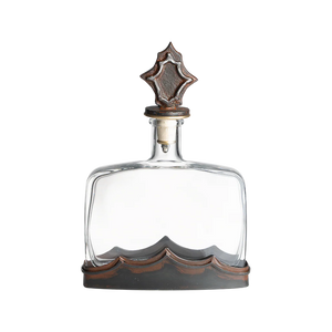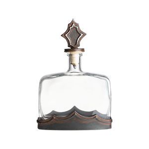 Glass decanter with cast iron topper inspired by Spanish nobility crests resting in a crown inspired forged iron tray