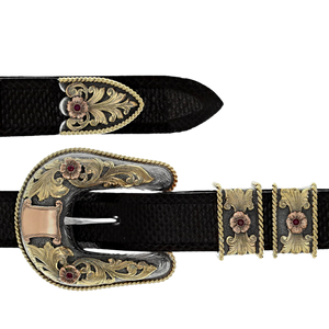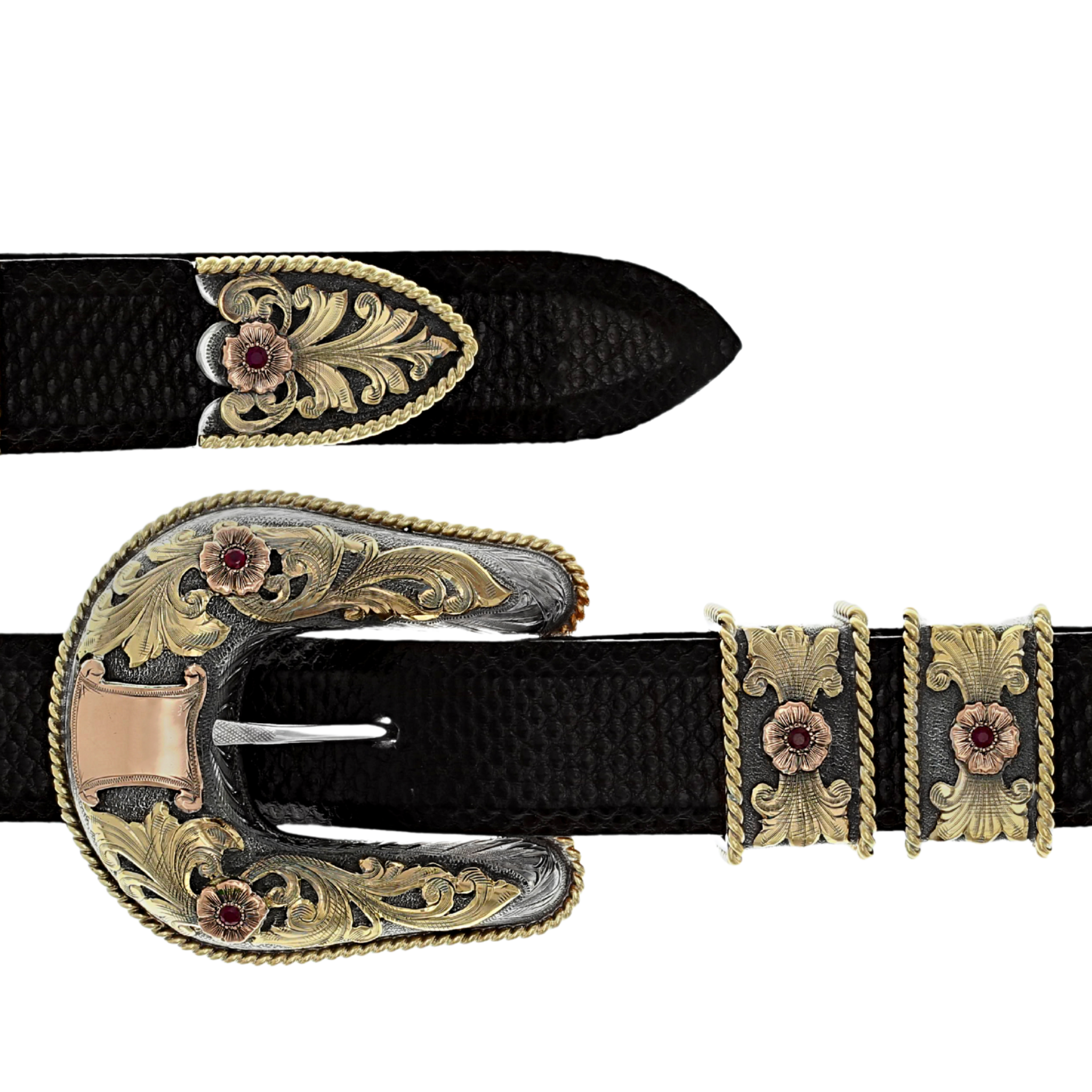 1" sterling silver buckle set with 14 karat yellow gold overlays, 16 gauge 14 karat yellow gold rope edge,10 karat rose gold hand cut shield, five 10 karat rose gold flowers set with 3.5mm rubies, engraved, four pieces.