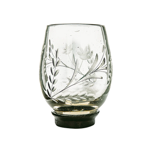 Mouth blown vessel with pepita engraving on iron stand.  Wine, votive, vase...