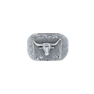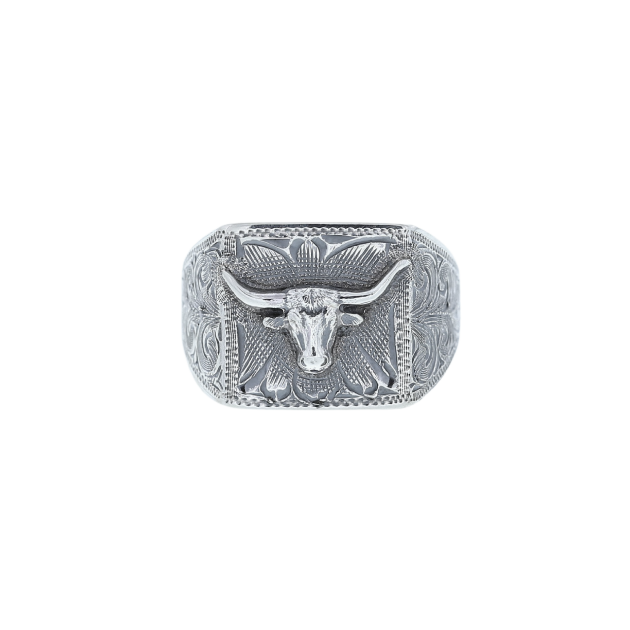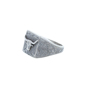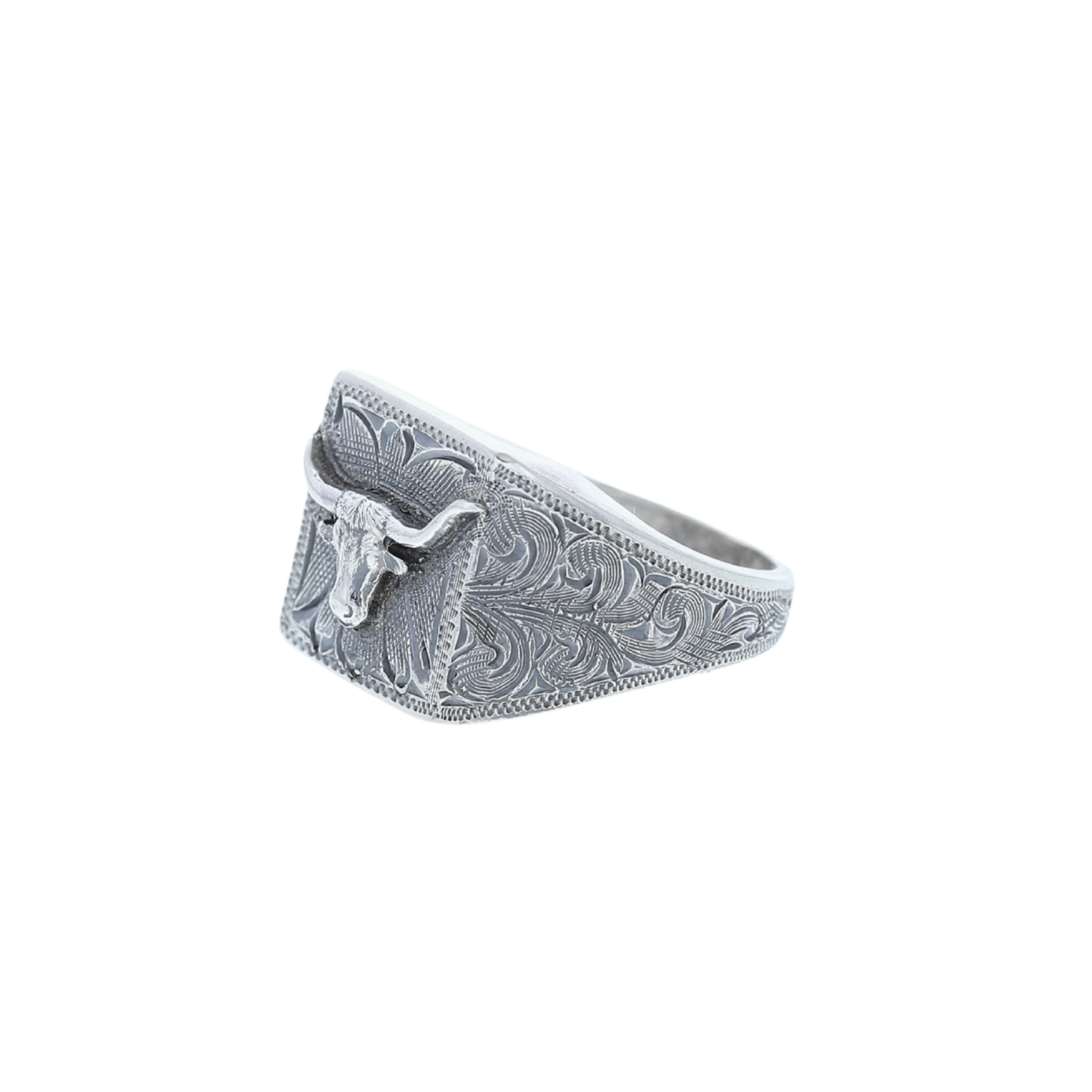 Sterling Ring, die-struck longhorn on face, engraved. Made and engraved by hand in Texas by Clint Orms Engravers & Silversmiths.