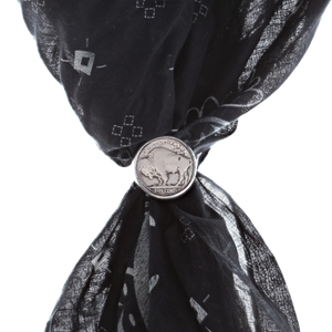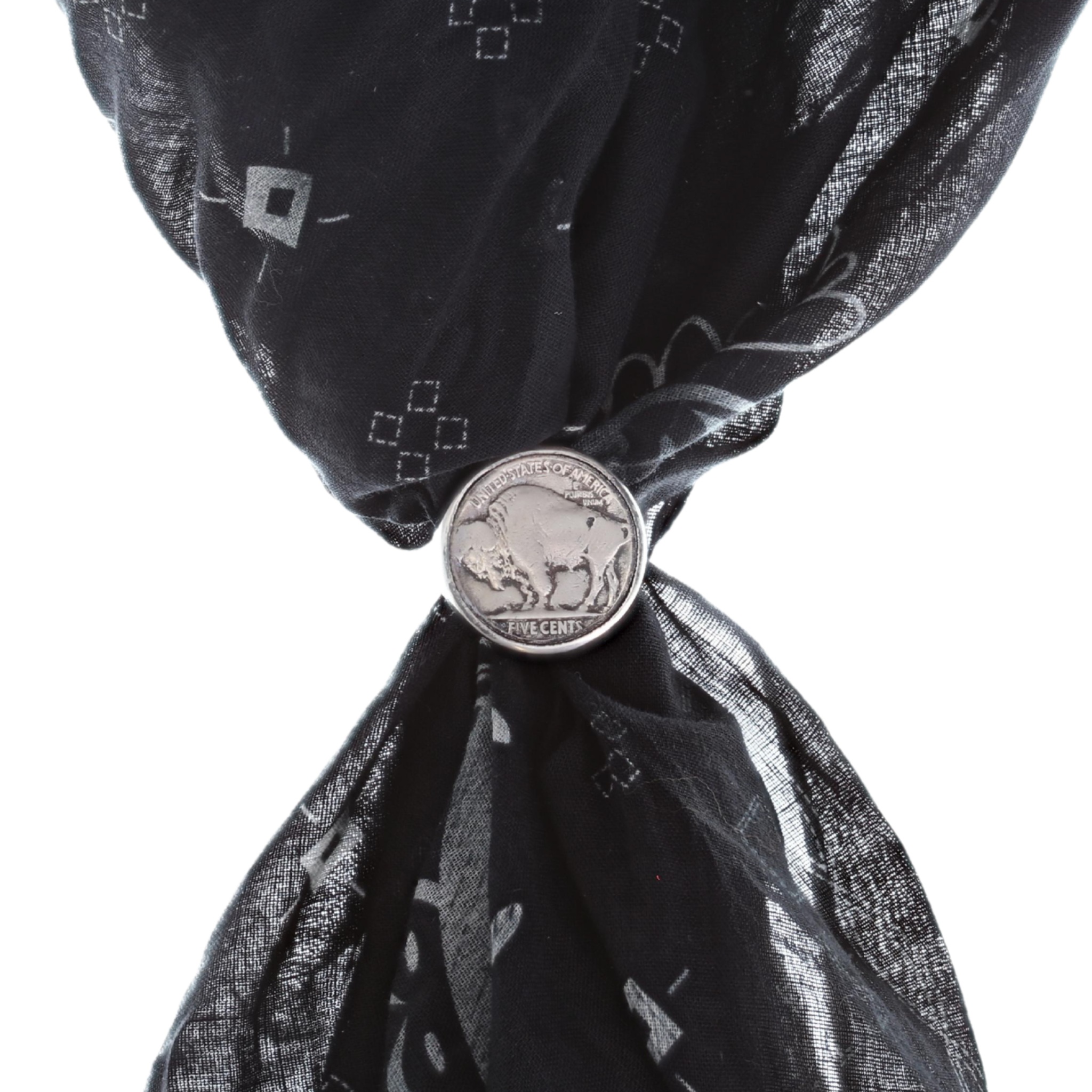 0.835" Round Sterling Silver Buffalo Nickel Scarf Slide; set in sterling silver bezel. Single Ring Back. Made and engraved by hand in Texas by Clint Orms Engravers & Silversmiths.
